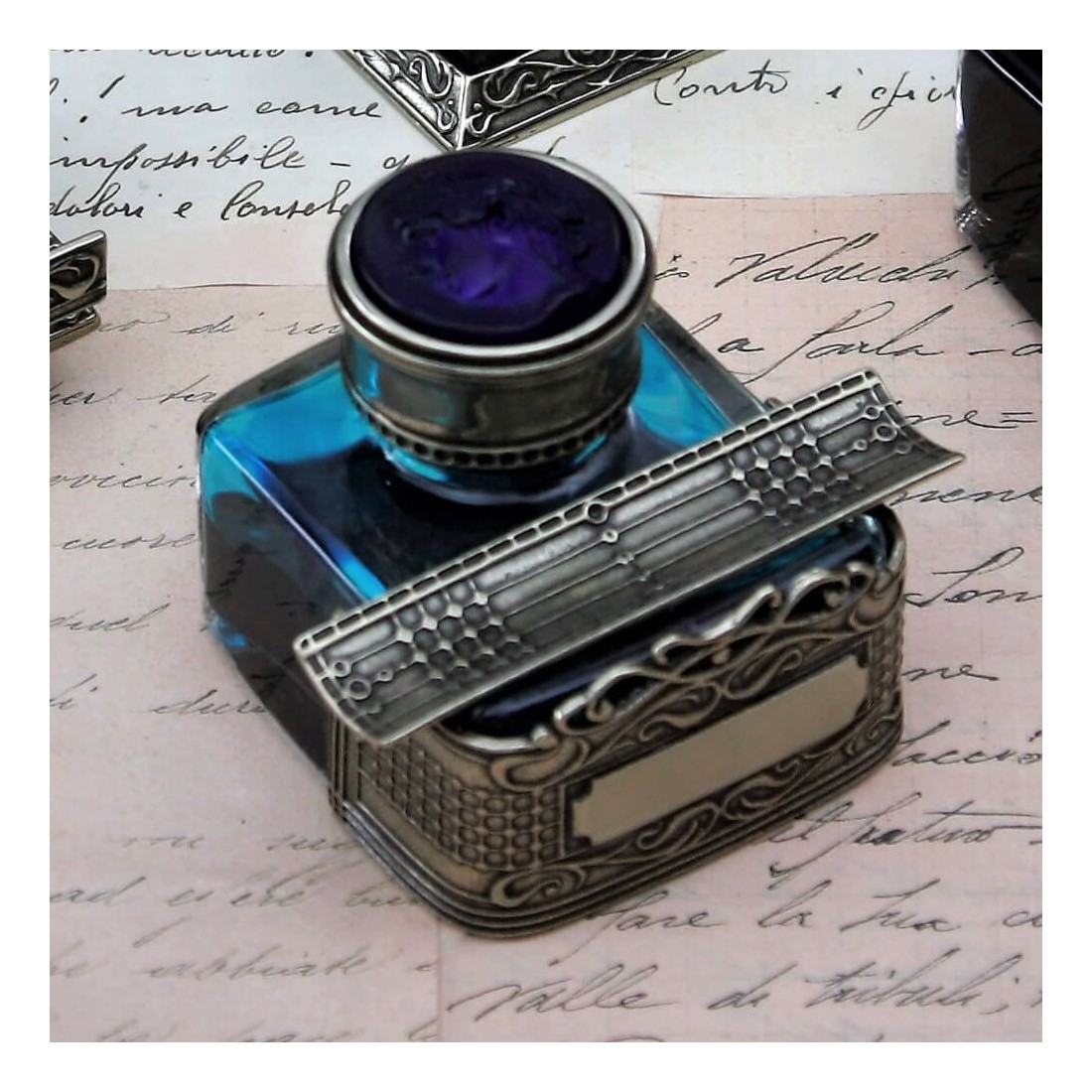 Forskellige Bortoletti blækfarver fyldt i traditionelle bronze og glas inkwells