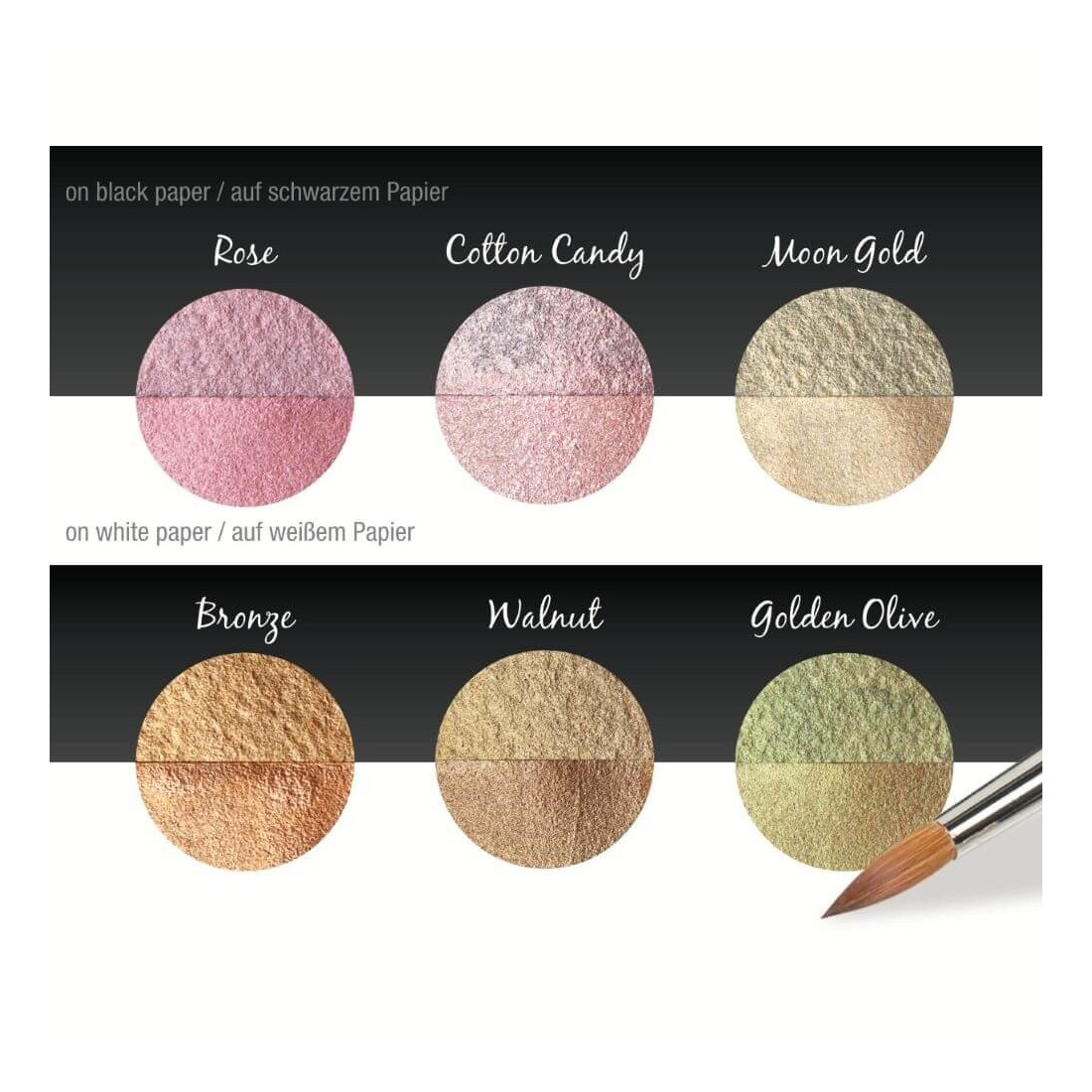 Lavet af glimmer, et naturligt mineral, der tilbyder et bredt udvalg af metalliske nuancer, fra guld og sølv til iriserende, skinnende perlefarver. Aktiver med lidt vand på paletten og gælder for nib med en børste. Overholder alle absorberende overflader, såsom papir, træ, gips osv.
