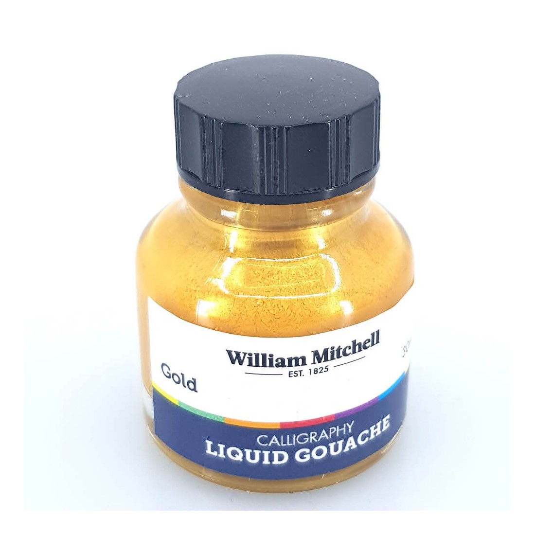 William Mitchell Liquid Gouache - Gold er en stærkt pigmenteret metallisk væske-gouache, der leveres i en bekvem 30 ml flaske. Tilbyder glat, uigennemsigtig dækning og lyskvaliteter, giver den en rig guldfinish ideel til kalligrafi, bogstaver og dekorativt kunstværk.