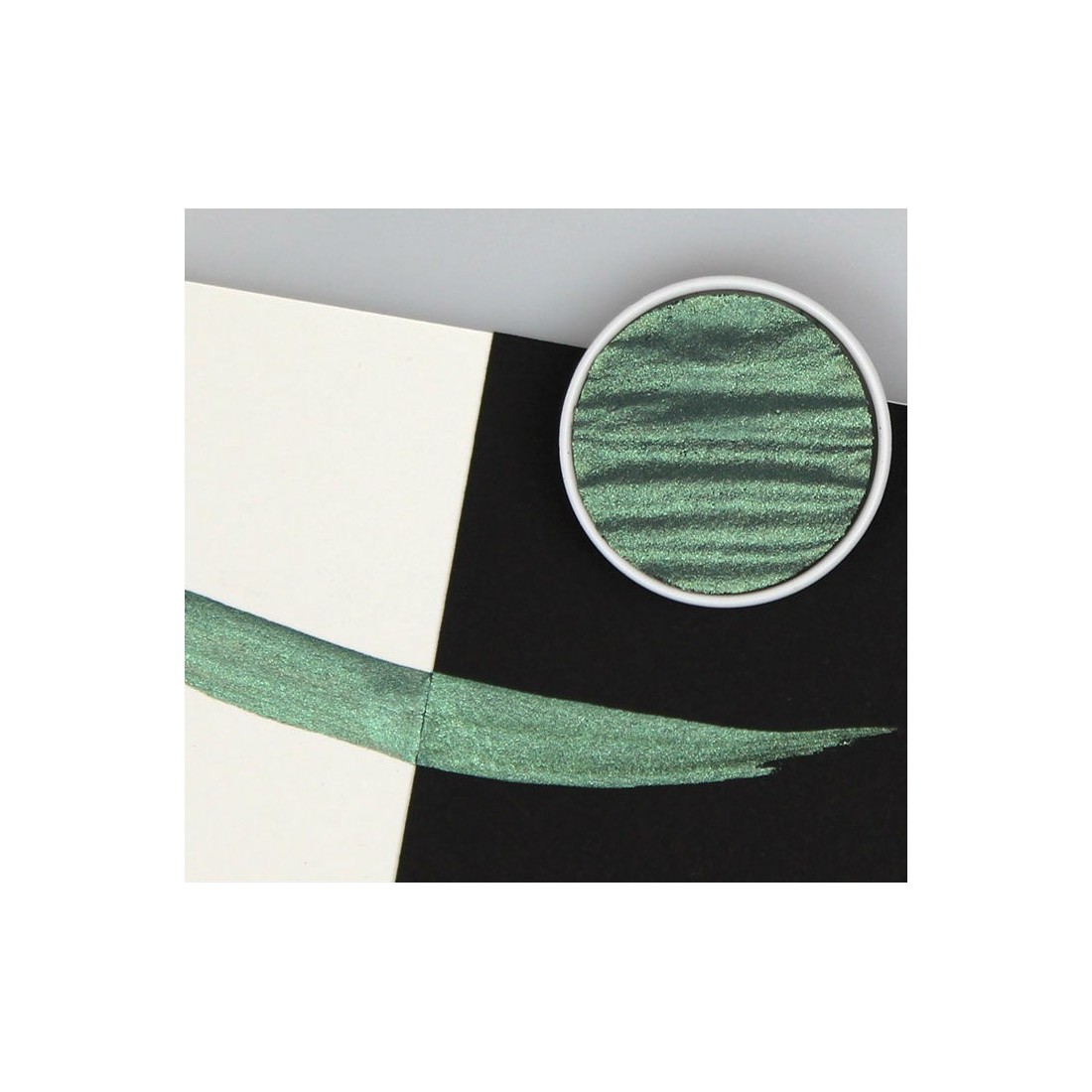 Coliro "Moss Green" Leveres i mærket papiremballage. Mærket kan placeres inde i a Coliro Metal palette boks til lettere farveidentifikation senere, hvilket er især nyttigt, når du bygger en personlig palette. Lad panden tørre helt efter brug og opbevare den på et tørt sted mellem projekter.