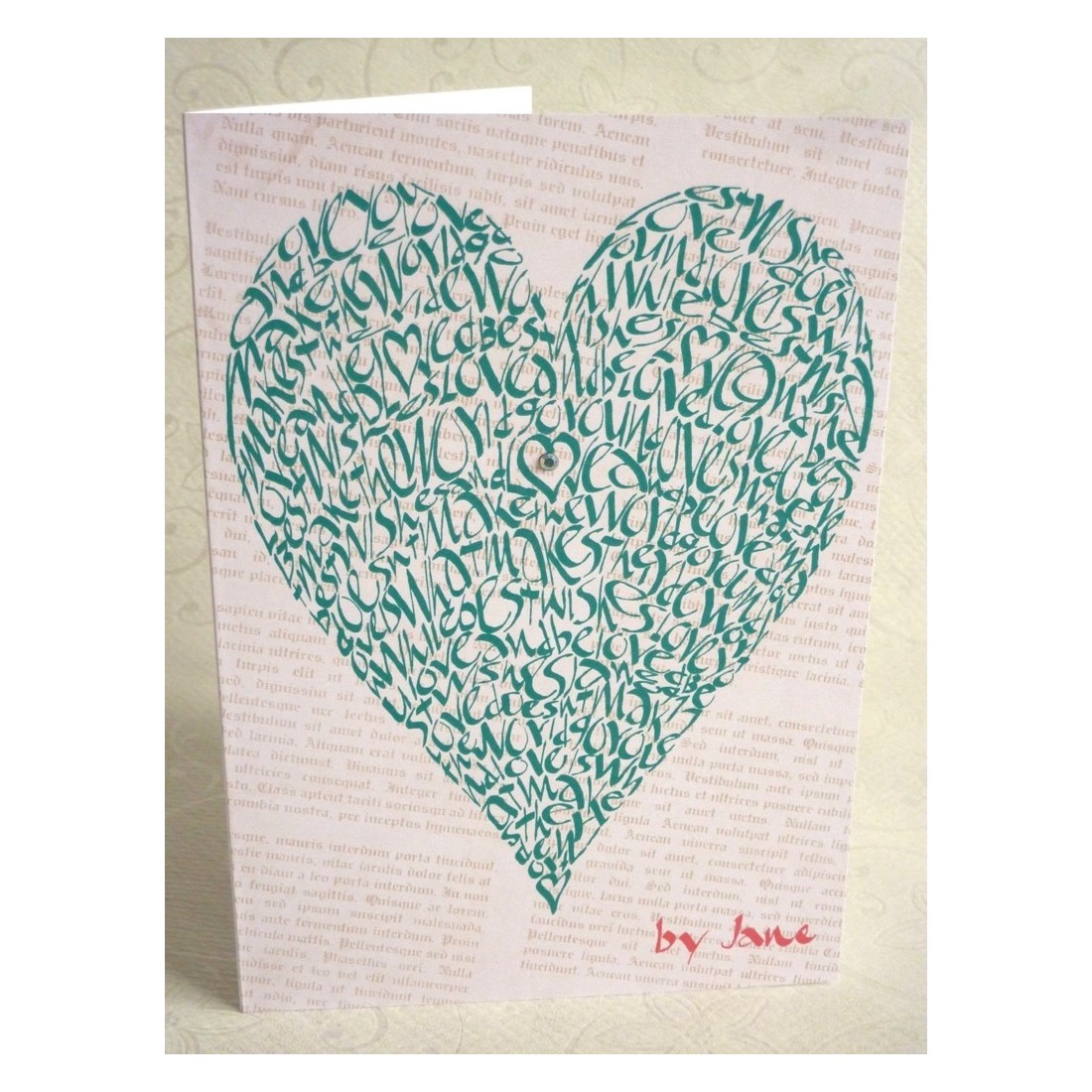 Kombinationen af kalligrafisk design, hjerteform, grøn styling og omhyggeligt placeret diamantes giver dette kort en charmerende håndlavet finish. Det skiller sig ud fra almindelige hilsner og tilbyder en mere kunstnerisk og personlig mulighed for kunder, der søger noget mindeværdigt.