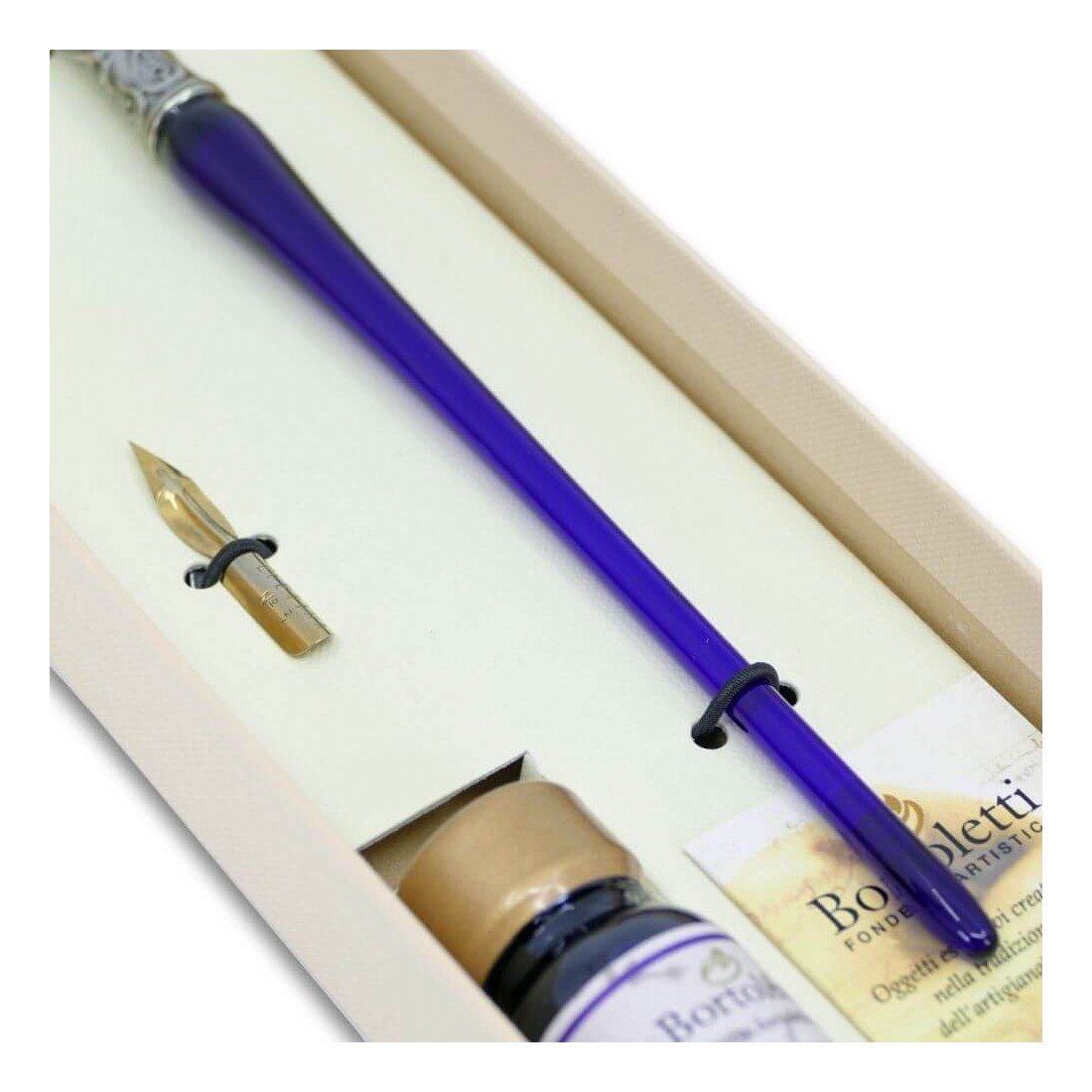Das Set wird in einer eleganten Kartonbox mit heißgeprägtem Bortoletti-Logo präsentiert und eignet sich daher besonders gut als Geschenk. Es ist eine durchdachte Wahl für Kalligrafen, Schreibbegeisterte, Liebhaber feiner Papeterie und alle, die sich zu schön gefertigten italienischen Schreibtischaccessoires hingezogen fühlen.