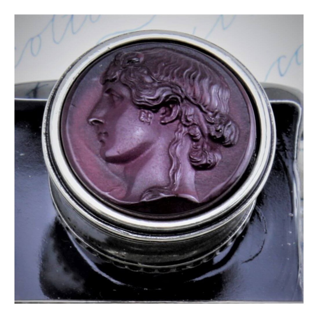 Bortoletti Vivaldi Glass & Bronze Inkwell Cal60 Ist ein handgefertigter venezianischer Inkwell mit einem eleganten Glaspaste Cameo in die Bronzekappe und eine integrierte Stiftruhe eingestellt. Mit seiner großzügigen 50 ml-Kapazität und dem raffinierten Design kombiniert er traditionelle Handwerkskunst mit praktischer Kalligraphie.