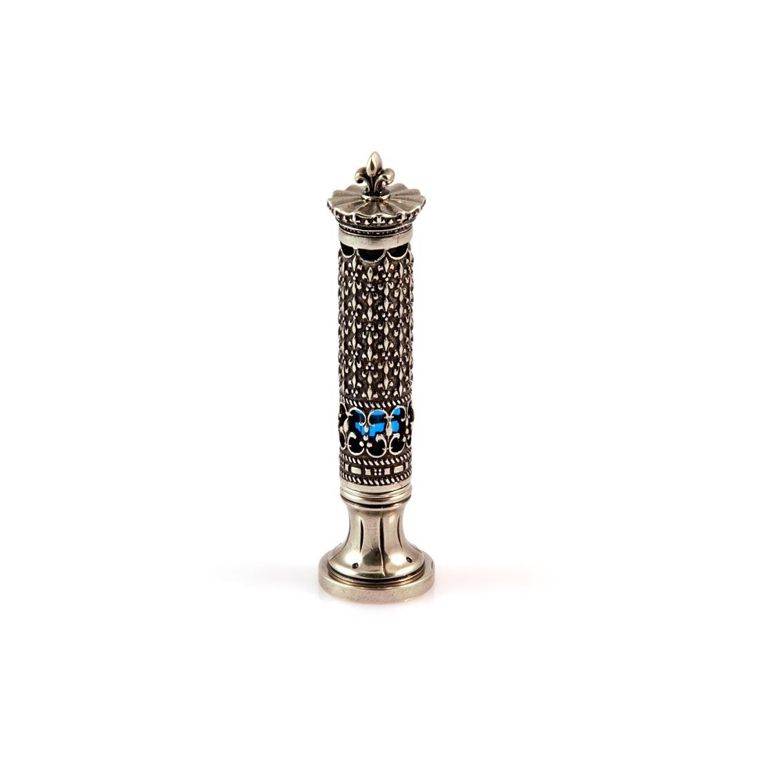 Die Bortoletti Corona Wachssiegel Stempelgriff Ist ein wunderschön dekoratives Dichtungszubehör in Venedig für Kunden, die gut italienische Handwerkskunst, Heritage-inspirierte Schreibtischzubehör und elegante Schreibtischdetails schätzen. In Bronze mit einem raffinierten nickelisch-versilberten Finish zusammengestellt und mit einer meerblauen Glastange eingestellt, ist dieser austauschbare Wachs-Siegelgriff, um sich zu kotzen Bortoletti 22 mm Wachssiegelstempel für ein unverwechselbares und personalisiertes Dichtungserlebnis.