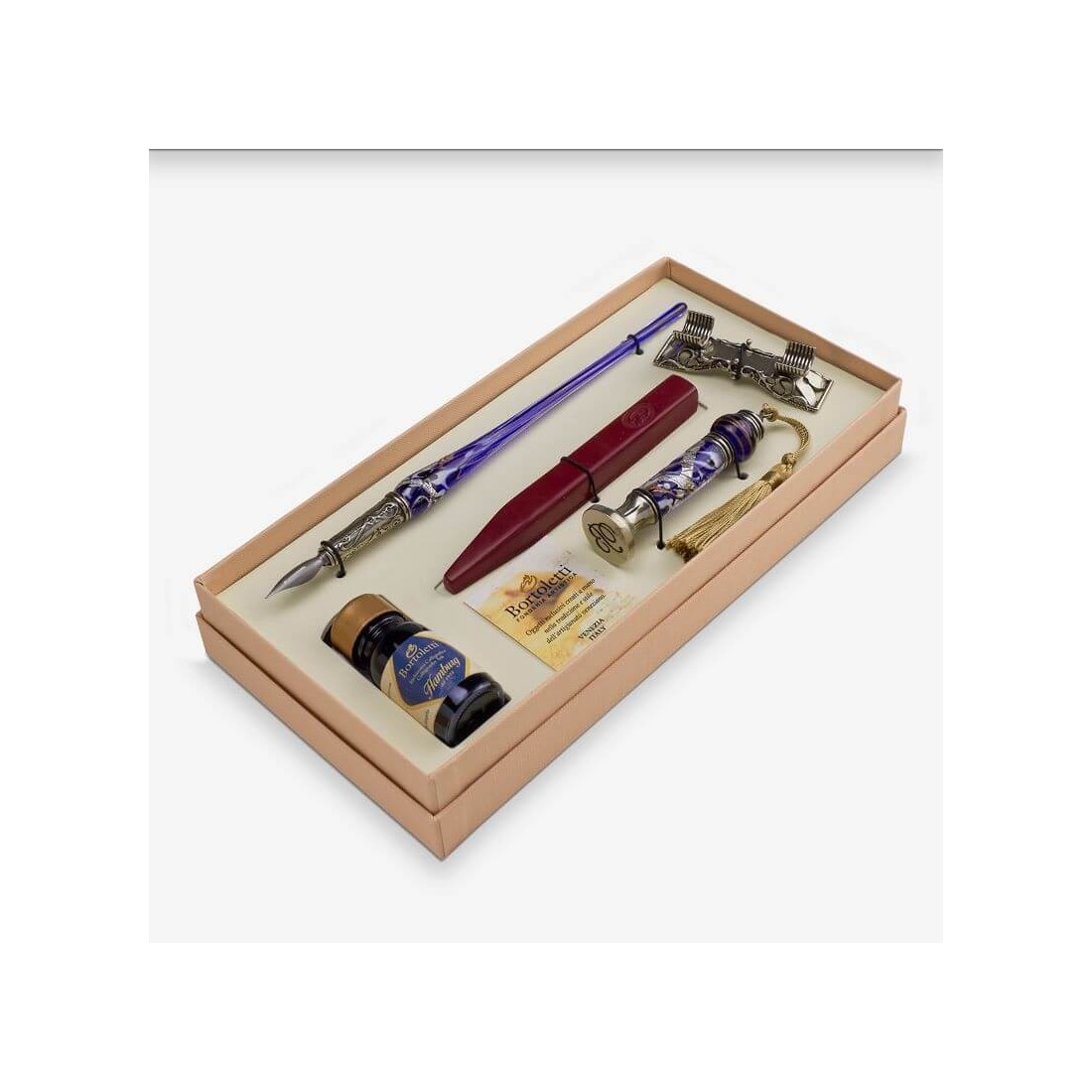 Das unverwechselbar Bortoletti Set beinhaltet ein Murano Glas Kalligraphie-Stift, a Nickel-Silber überzogener Bronze-horizontaler Stifthalter, a Murano-Glaswachs-Siegelgriff, ein austauschbare Dichtplatte, Kalligraphie-Tinte, Präsentationspaket und ein Garantieurkunde. Es bietet eine elegante Möglichkeit, handgeschriebene Korrespondenz mit traditioneller Wachsabdichtung zu kombinieren, alles innerhalb eines koordinierten venezianischen Sets.