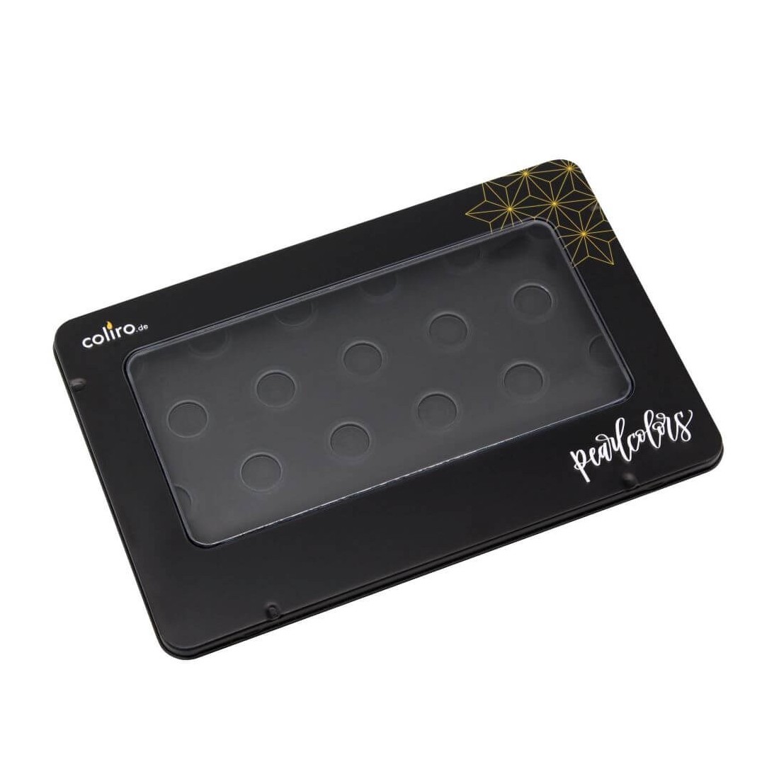 Geräumige schwarze Metallpalette für 22 Coliro Pearlcolors. Mit einem klaren Deckel und Raum für Namensaufkleber, perfekt für die Organisation größerer Sammlungen.