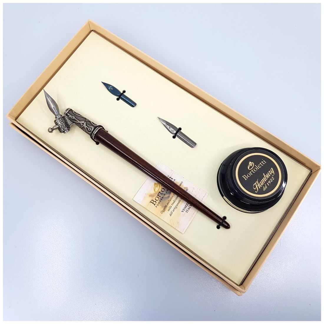 Von qualifizierten Handwerkern produziert, Bortoletti Schreibinstrumente sind bekannt für ihre Aufmerksamkeit auf Details und dekorative Oberflächen. Die Kombination aus natürlichem Holz und warmen Bronze-Tönen macht dabei eine schöne Ergänzung zu einem Kalligraphieschreibtisch und einem nachdenklichen Geschenk für Beschriftungsbefriedigung.
