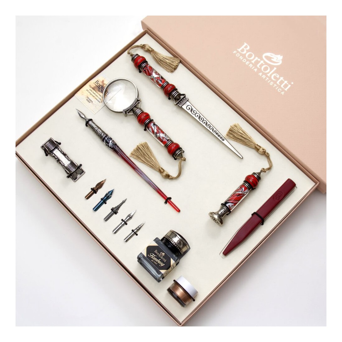 Beim Calligraphy Arts UK, wir wählen spezialisierte Kalligraphie-Tools, Siegelwachs-Zubehör, Schreibwarenprodukte und herrlich inspirierte Schreibtischzubehör, die vertrauenswürdige Handwerkskunst und dauerhafte visuelle Anziehungskraft bieten. Diese Bortoletti Für Kunden wurde für Kunden gewählt, die ein Premium-Murano-Glas-Schreibsemble suchen, das dekorative Schönheit, praktische Funktion und geschenkwürdige Präsentation kombiniert.