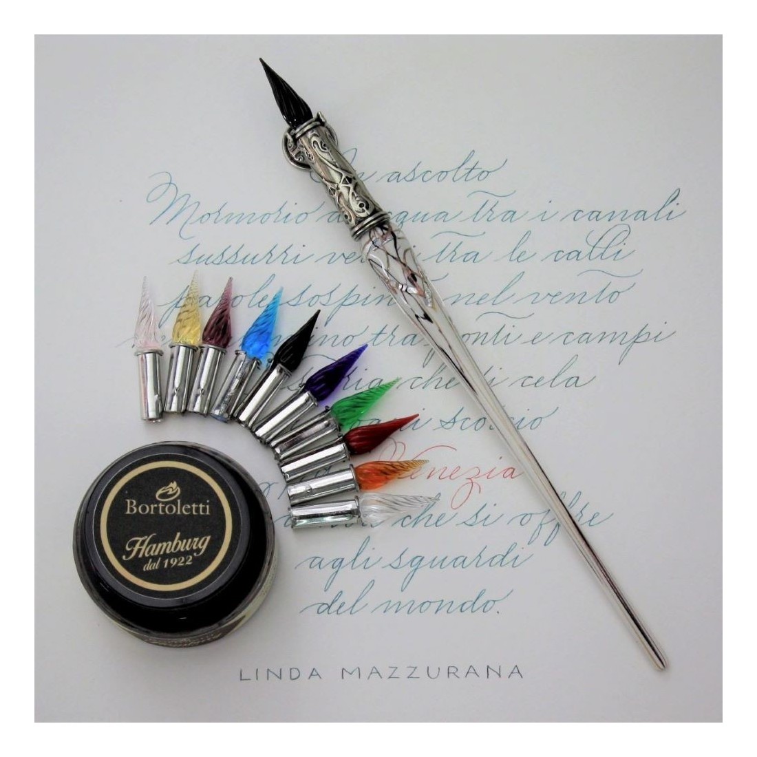 Beim Calligraphy Arts Großbritannien Wählen Sie Fachkalligraphie-Tools, Abdichtungswachs-Zubehör, feiner Briefpapier- und Heritage-inspiriertes Schreibtischzubehör für Kunden, die Authentizität, Handwerkskunst und Qualität wertschätzen. Die Bortoletti Contarini Murano-Glas-Dip-Stift mit silbernem Blatt wurde für seine eleganten Materialien, künstlerischen Schreibbeschwerer und starker Anschluss an traditionelle venezianische Handwerkskunst ausgewählt.
