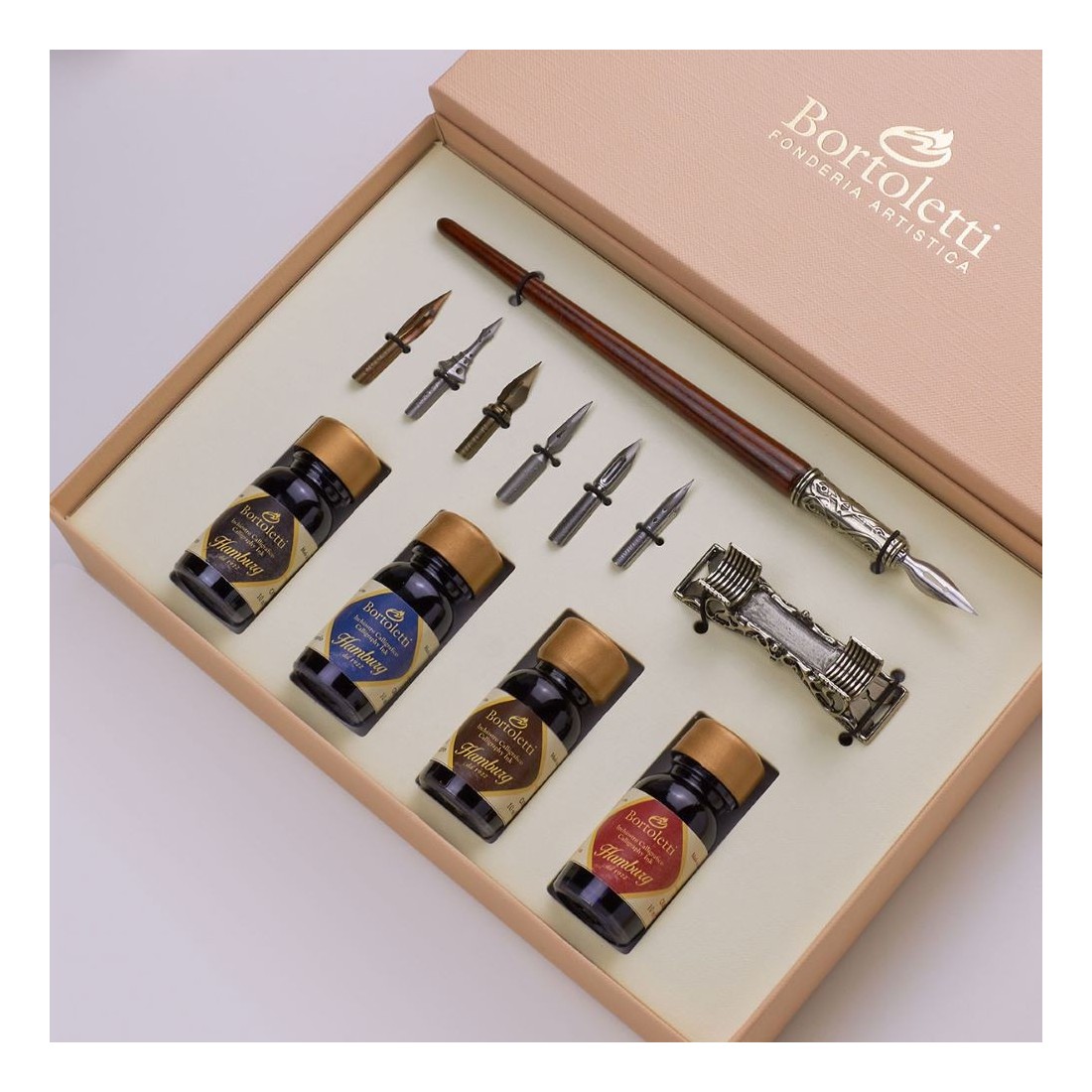 Bortoletti Guardi Hölzerne Kalligraphiesatz mit sechs Fleisch ist ein raffiniertes venezianisches Schreibsatz mit einem handgefertigten Holzstift mit Bronze-NIB-Halter, sechs austauschbaren Nibs, vier 15 ml Flaschen Kalligraphie-Tinte und Bedienungsanleitungen in Englisch und Italienisch. In einer eleganten Geschenkbox präsentiert, ist es eine ausgezeichnete Wahl, um verschiedene Kalligraphie-Stile mit einem erbe inspirierten Schreibwerkzeug zu erkunden.