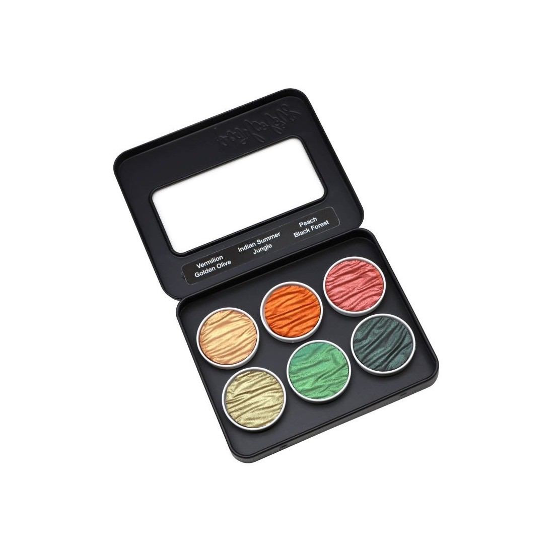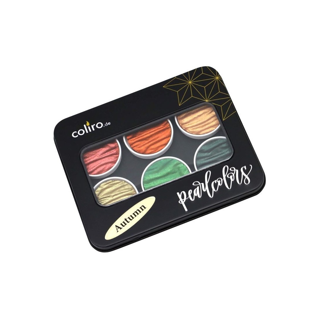 Coliro "Autumn" pearlcolor set is a rich seasonal palette filled with warm metallic tones and deep natural colour. Presented in a metal box, it includes "Vermilion Red", "Indian Summer", "Peach", "Golden Olive", "Jungle" and "Black Forest", making it ideal for decorative calligraphy, illustration and artwork inspired by autumn light, woodland depth and glowing detail.