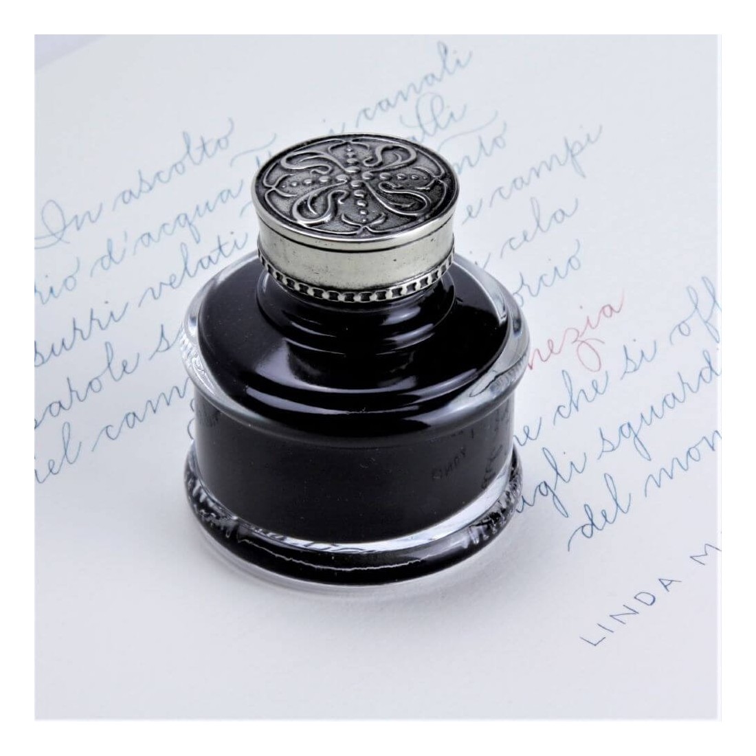 This inkwell includes high-quality Bortoletti – Hamburg calligraphy ink, known for its rich pigmentation and strong colour retention once dry. The Cagliostro black ink evokes the mystery and depth of alchemical tradition, producing bold, expressive lettering with excellent flow.