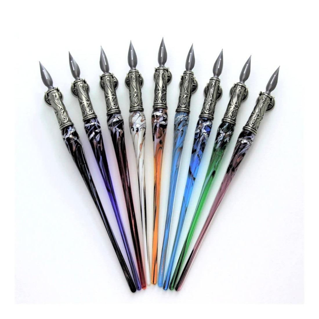 Cada conjunto cuenta con elementos de vidrio Murano hechos a mano mejorados con delicado Detalles de hoja de plata y está disponible en una selección de Azul, Ámbar, Aquamarine, Turquesa, Amatista, Verde, ROJO, Negroy Marfil. Esta amplia gama de colores facilita el elegir un conjunto que se adapte a un escritorio, estilo interior, preferencia de papelería o ocasión de regalo.