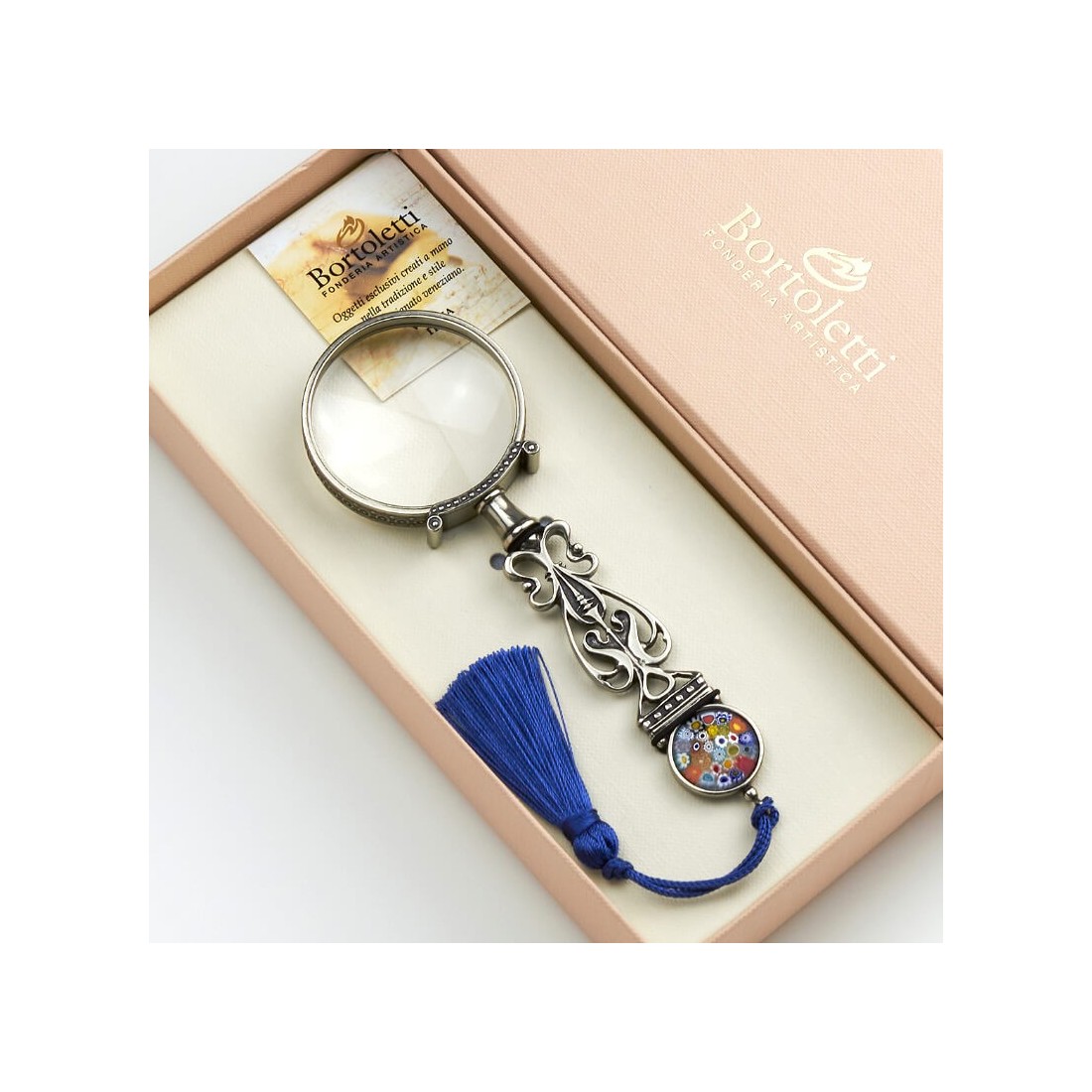 Bortoletti Las creaciones reflejan los gustos y las costumbres de las épocas distantes, mientras que permanece original en diseño. La lupa del canal es el resultado de la investigación de diseño en curso desarrollada con joyeros maestros y artesanos calificados, reuniendo metalúrgicos decorativos, arte tradicional de vidrio y un refinado sentido de equilibrio.