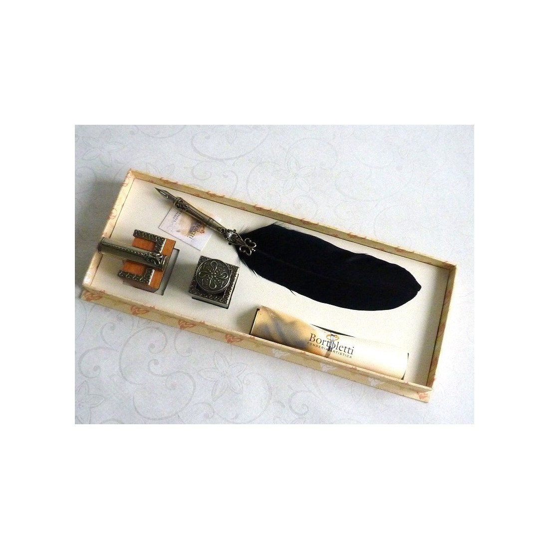 La Bortoletti Set82 Classic Feather Quill Set es un conjunto de escritura decorativa creada para aquellos que aprecian las herramientas de caligrafía tradicionales, los accesorios elegantes de escritorio y la artesanía italiana inspirada en la herencia. Este conjunto artesanal incluye una pluma de plumas de ganso natural con un agarre de bronce, un tintero lleno de tinta de caligrafía de Cagliostro negro de alta calidad, un titular de la pluma de madera de beechwee con friezes de bronce y un pergamino que dice la historia de la escritura.