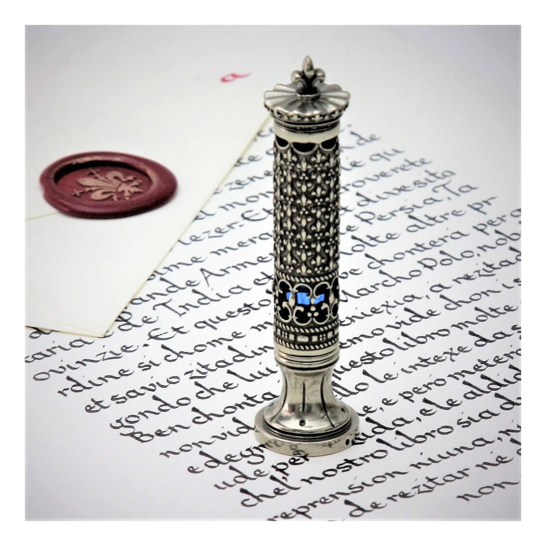 Bortoletti Es un fabricante italiano asociado con Venecia, metalúrgico decorativo, fundición de cera tradicional, influencias de vidrio de Murano y accesorios de escritorio fino. El mango de sello de sello de cera de Corona refleja ese patrimonio a través de su forma adornada, detalles terminados a mano y materiales cuidadosamente seleccionados. Es un accesorio de sellado que combina uso práctico con la identidad artística para la cual se admira la artesanía veneciana.