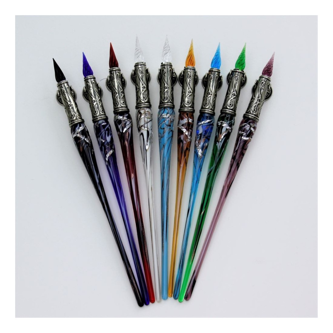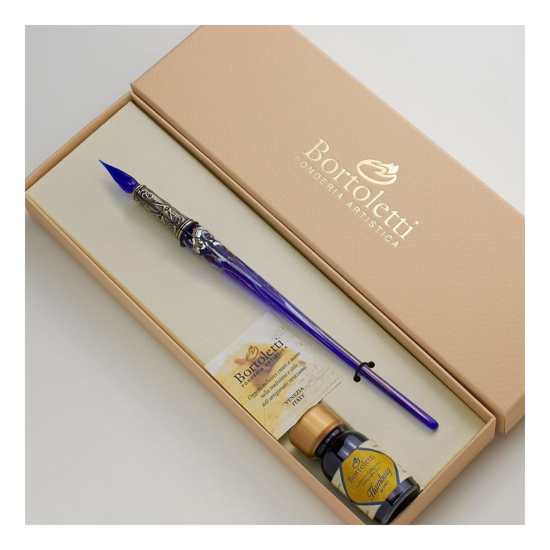 En Calligraphy Arts Reino Unido, seleccionamos Herramientas de caligrafía especializadas, accesorios de cera de sellado, papelería fina y accesorios de escritorio de inspiración por patrimonio para los clientes que valoran la autenticidad, la artesanía y la calidad. La Bortoletti La pluma DIP de vidrio de contarini Murano con hoja de plata se ha elegido por sus materiales elegantes, una apelación artística de escritura y una fuerte conexión con la artesanía tradicional veneciana.