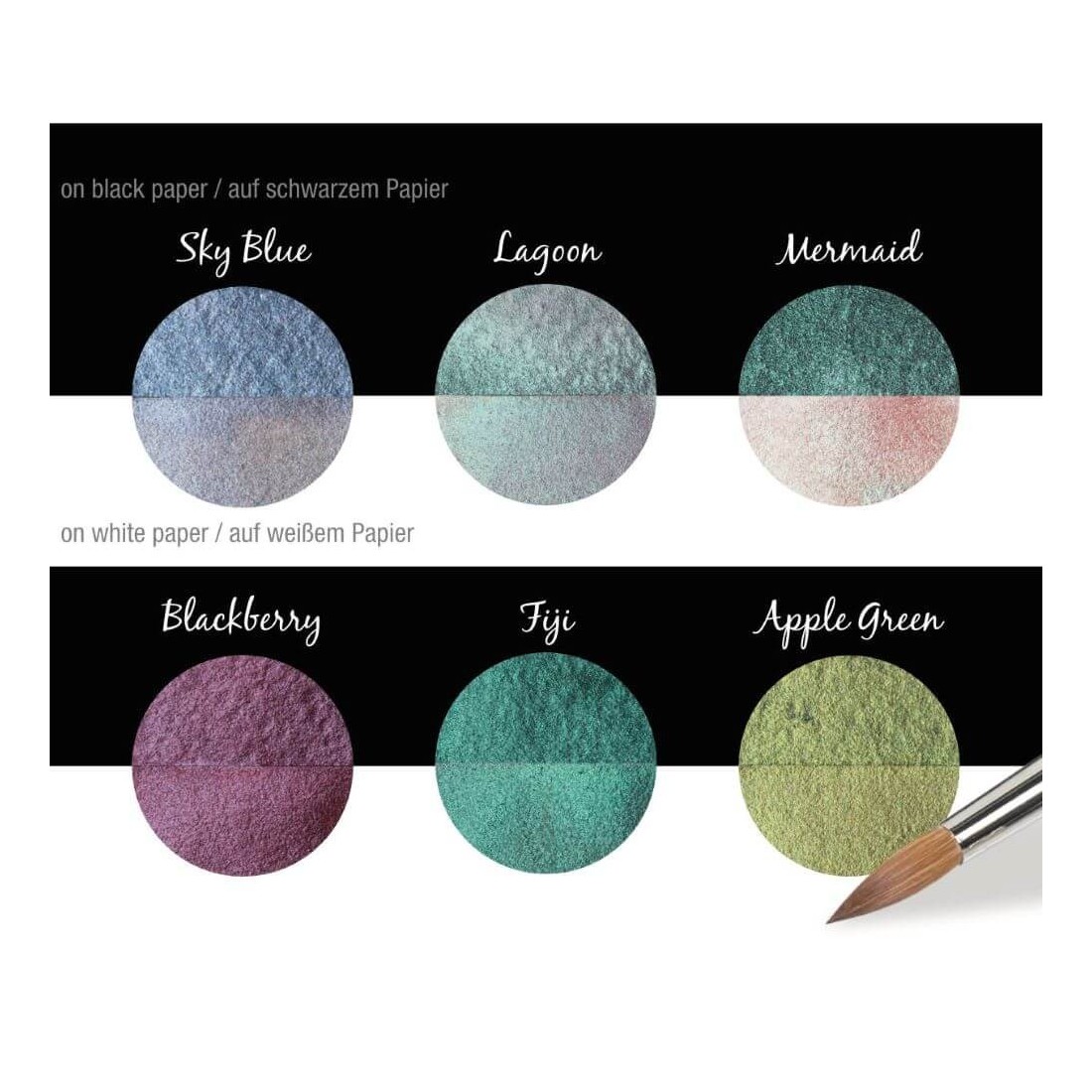 Hecho con MICA, un mineral natural que crea una amplia variedad de tonos metálicos y brillantes, este conjunto se activa fácilmente con un poco de agua y se adhiere a las superficies bellamente absorbentes, como papel, madera, yeso y piedra. Las bandejas se pueden quitar de la caja, y los colores de reemplazo están disponibles, lo que hace que este sea un conjunto práctico para el uso creativo regular, así como los proyectos especiales.