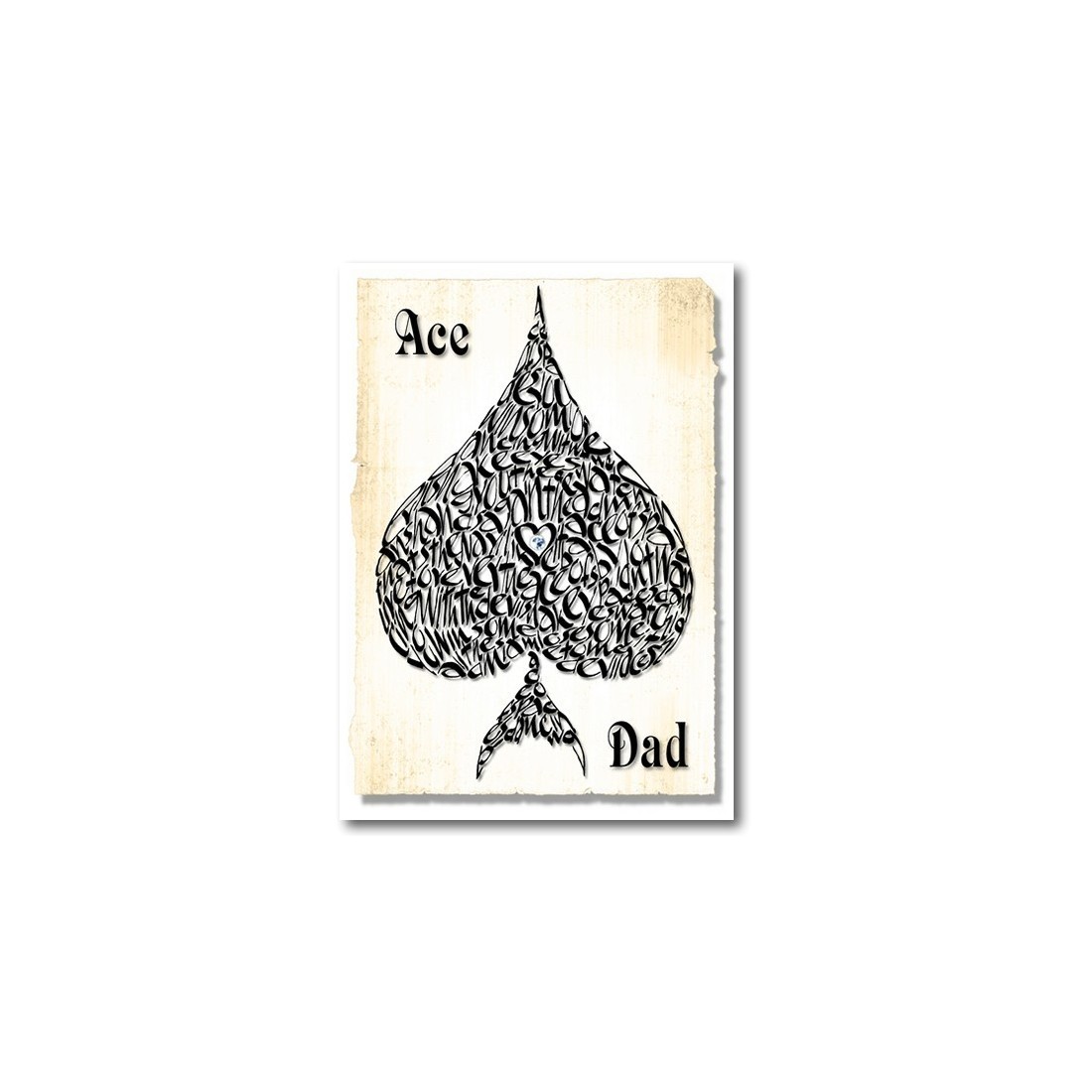 La tarjeta de papá de ACE de Calligraphy Arts es una tarjeta de un Día de Padre Hecha a mano diseñado por Jane, con ACE de Spades inspirado en la palabra caligráfica, que incluye "The Ace of Spades""Dancing with the Devil"y"You win some, lose some, it's all the same to me", Terminado con un gran diamante sobre un fondo apenado.
