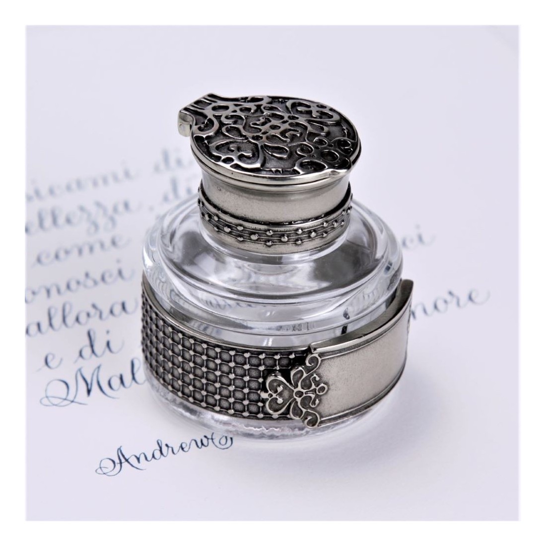 Bortoletti Dandolo Glass & Bronze Inkwell CAL55 On käsityönä oleva venetsialainen muste, jossa on tyylikäs inlaid valkoinen pronssi saranoitu kansi ja pyöristetty lasisäiliö. Suunniteltu sekä toiminnalliseksi kirjoitustyökaluksi että koristeelliseksi pöydälle, tämä hienostunut muste heijastaa perinteistä italialaista käsityötaitoa ja ajattomia tyyliä.