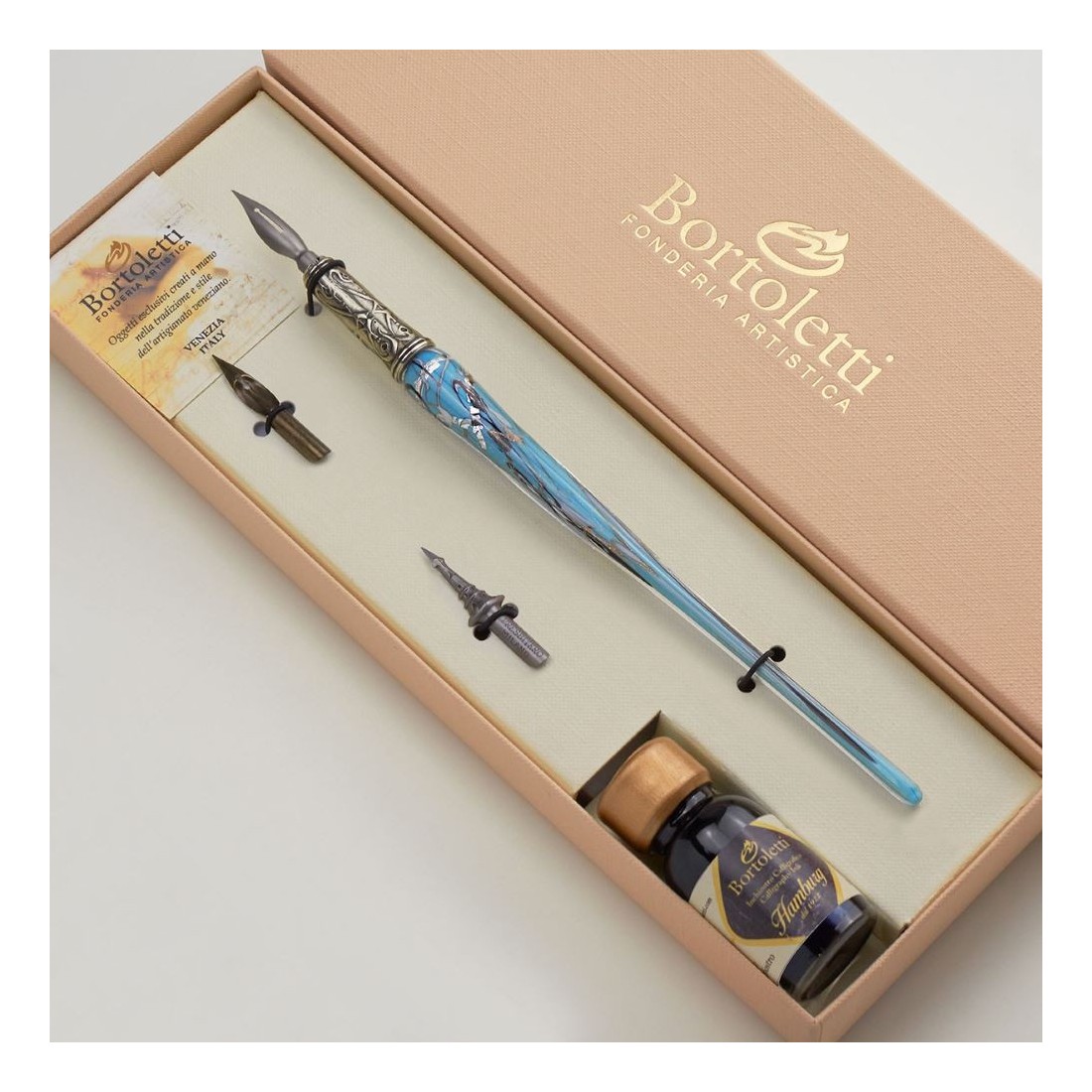 Bortoletti Grimani Murano lasi kalligrafia, jossa on hopea lehti on käsityönä oleva venetsialainen kirjoitusjoukko, joka on valmistettu lampceed muran lasilla, hopea lehtien yksityiskohtaisesti, 15 ml: n pullo Hamburg Kalligrafiallinen muste ja vaihdettavat nbs-valikoima valikoima kirjoitustyylejä. Saatavana yhdeksässä tyylikkäässä lasivasessa ja esitetään lahjapakkauksessa, jossa on kultainen kuuma leimattu logo, se on hienostunut valinta kalligrafiakäytännölle, tyylikäs käsinkirjoitus ja lahja antaa.