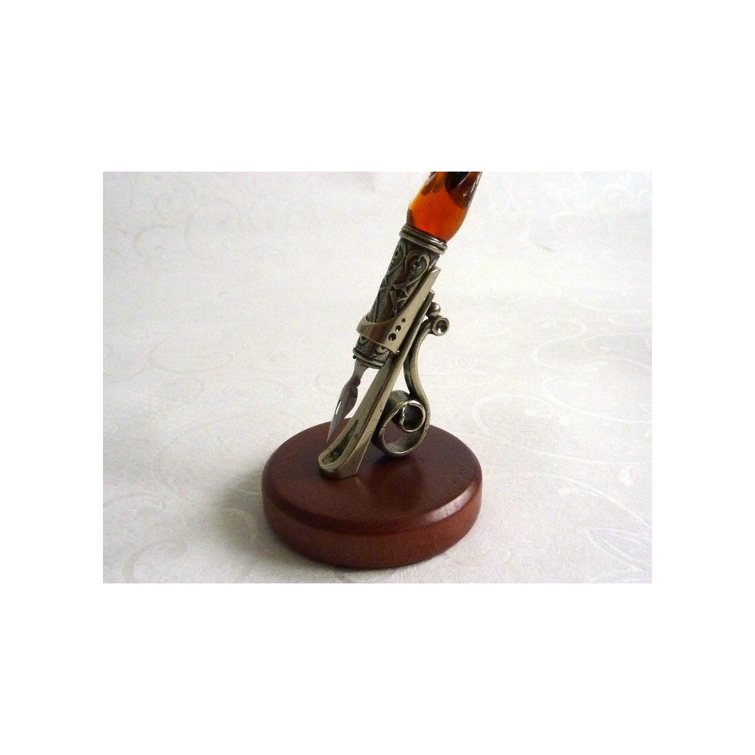 Yksinkertaisuus koristeet yhdistetään ilmeikäs materiaalien lujuus. Tämä lyijykynä on valmistettu puusta ja hienoksi työskenteli uushopea. On olemassa kaksi versiota. Yksi lasi tai puinen kynä. Muiden on suunniteltu Feather kynä. Molemmat tyylit ovat tyylikkäitä kappaleita, jotka antavat persoonallisuutta kirjoituspöytä.
