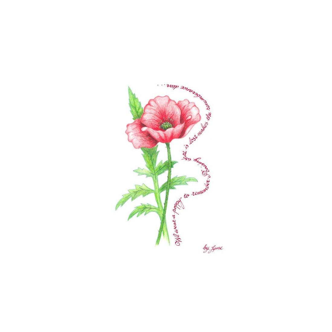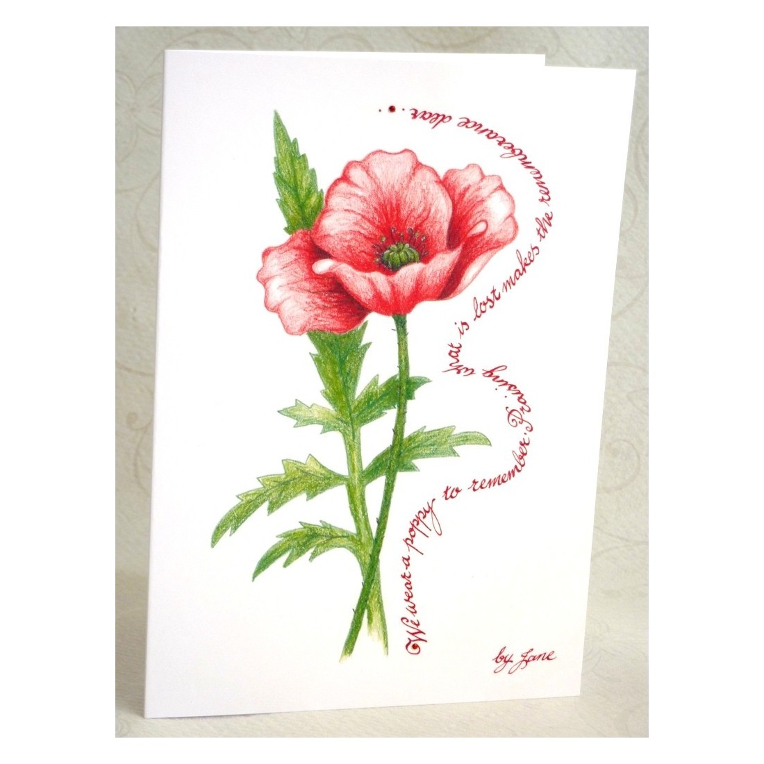Keski-Poppy Artwork oli alunperin käsi kädessä Janen lyijykynällä antaen kortille henkilökohtaisempi ja taiteellinen laatu kuin tavallinen painettu muotoilu. Calligrafia Remembrance-sanat on kiinnitetty kukka, mikä auttaa kuvaa ja sanamuotoa yhdessä lempeässä, heijastavalla tyylillä.