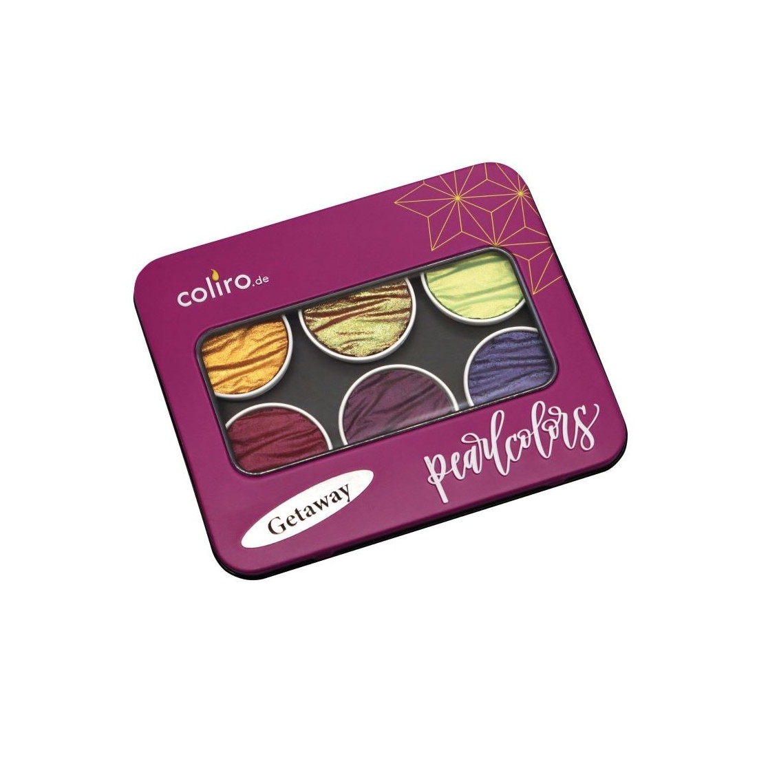 Coliro "Getaway" Pearlcolor Set on matkailu-innoittamana kokoelma, joka on suunniteltu tuomaan tunne paeta ja väriä luovaan työhön. On esitetty violetti metallikotelossa, se sisältää kuusi hohtavaa sävyä - "Inca Gold", "Spellbound", "Golden Meadow", "Burgundy", "Black Currant" ja "Cosmic Purple" - Ihanteellinen koristeellinen kalligrafia, kuvitus ja valoisa taiteellinen yksityiskohdat.
