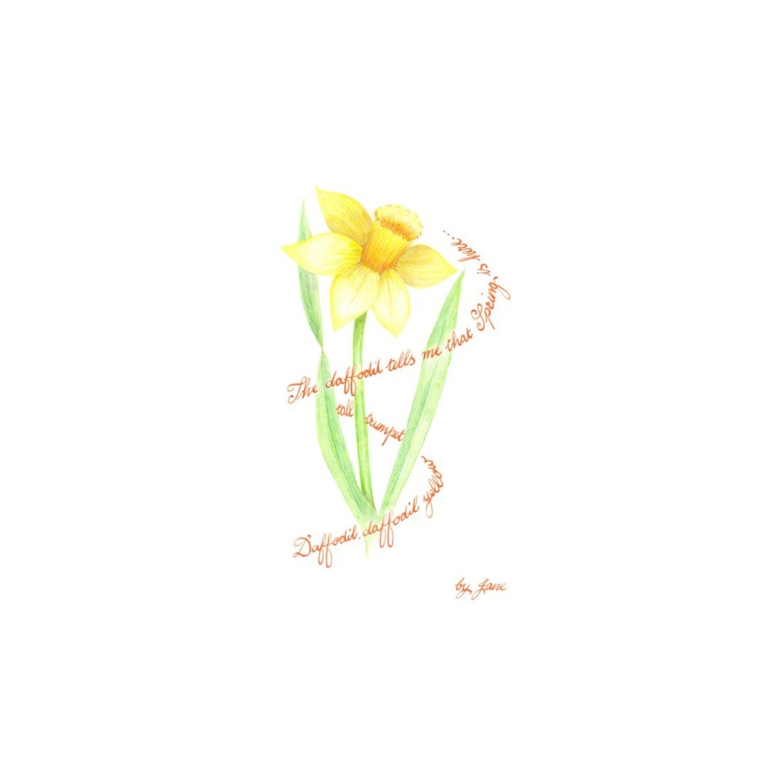 Kevään narsissikortti Calligraphy Arts On kaunis kalligrafia-kortti, jonka on suunnitellut Jane, jossa on käsin piirretty narsissikuva sanoilla "Daffodil, Daffodil, Keltainen Trumpetti Tall" ja "Daffodil kertoo minulle, että kevät on täällä" kukka ympärillä.