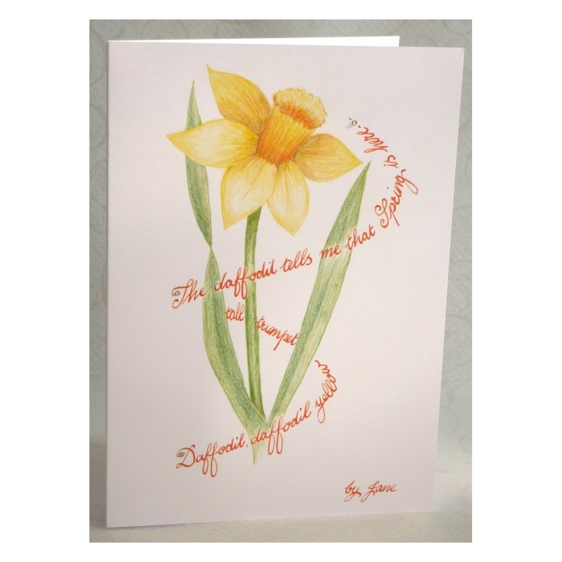 Spring Daffodil-kortti on viehättävä kukkakortti Calligraphy Arts, jonka Jane on suunnitellut juhlia kevään tuoreutta ja kauneutta. Alun perin käsi piirretty lyijykynällä, tämä ihastuttava narsissirakenne yhdistää herkkää kukka-taidetta kalligrafian sanamuodon kanssa kukka, joka luo kortin, joka tuntee sekä taiteellisen että kohotuksen.