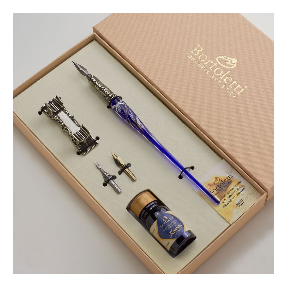 Bortoletti Jeu de calligraphie de verre Renier Murano est un ensemble de rédaction vénitien raffiné avec un stylo en verre de Murano fait main a travaillé avec une feuille d'argent, un porte-nib en bronze, trois nibres vintage, une encre de qualité et un repose-stylo de bronze d'origine. Magnifiquement équilibré pour l'écriture et l'affichage, c'est un choix élégant pour la pratique de la calligraphie, des mots manuscrits significatifs et des cadeaux donnant des cadeaux.