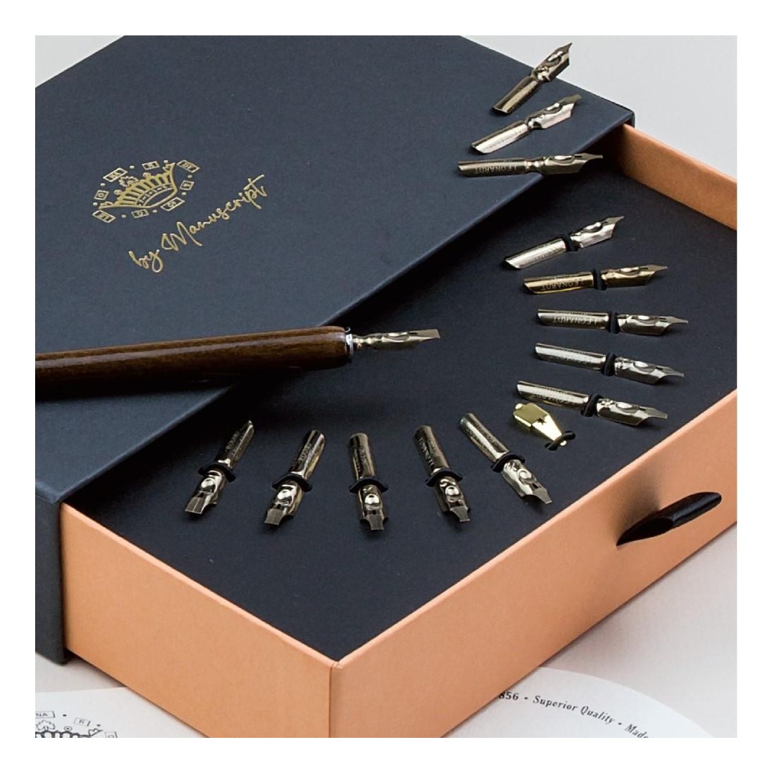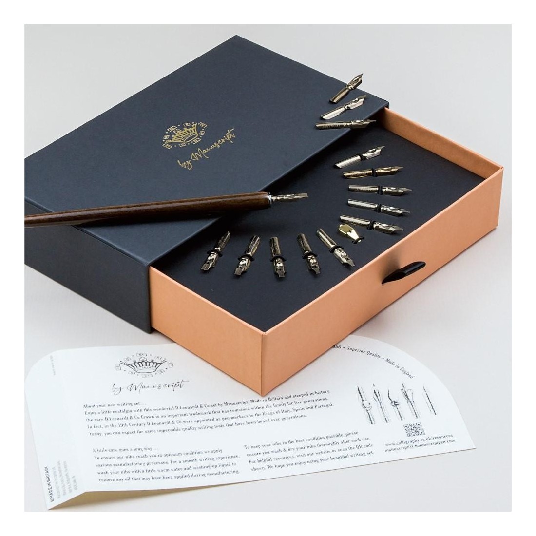 Une collection héritage magnifiquement présentée à partir de Manuscript Doté de dix D. Leonardt & Co Round Main Nibs et un porte-nib en bois marbré avec réservoir d'encre. Parfait pour les styles de calligraphie classiques de bord large tels que des scripts italiques, gothiques et incuaux.