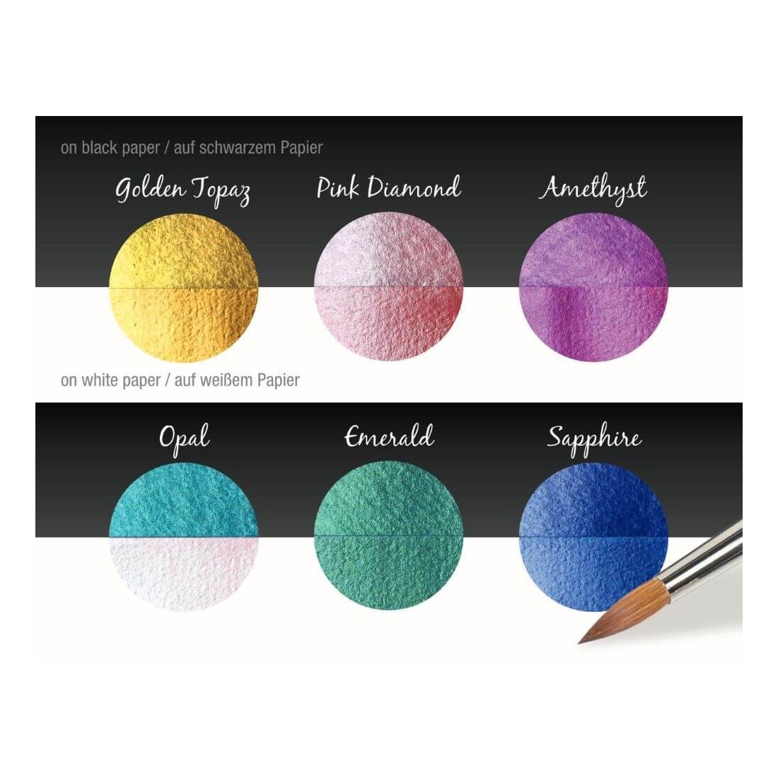 Cette boîte en métal contient cinq nuances de couleurs opaques "Golden Topaz", "Pink Diamond", "Amethyst", "Emerald" et "Sapphire" ainsi que la couleur translucide "Opal" - celle-ci est brillante sur du papier noir et scintillante sur du blanc papier