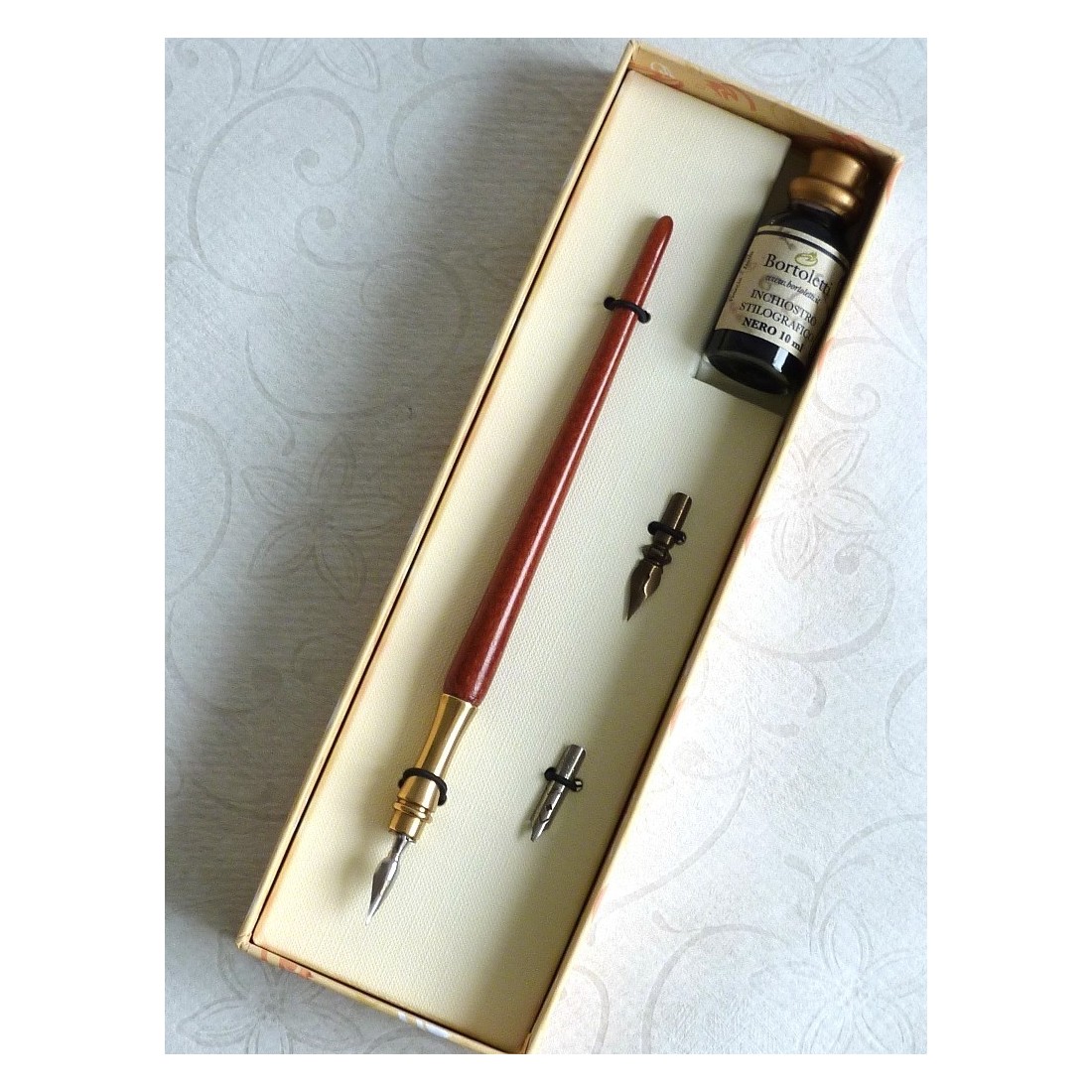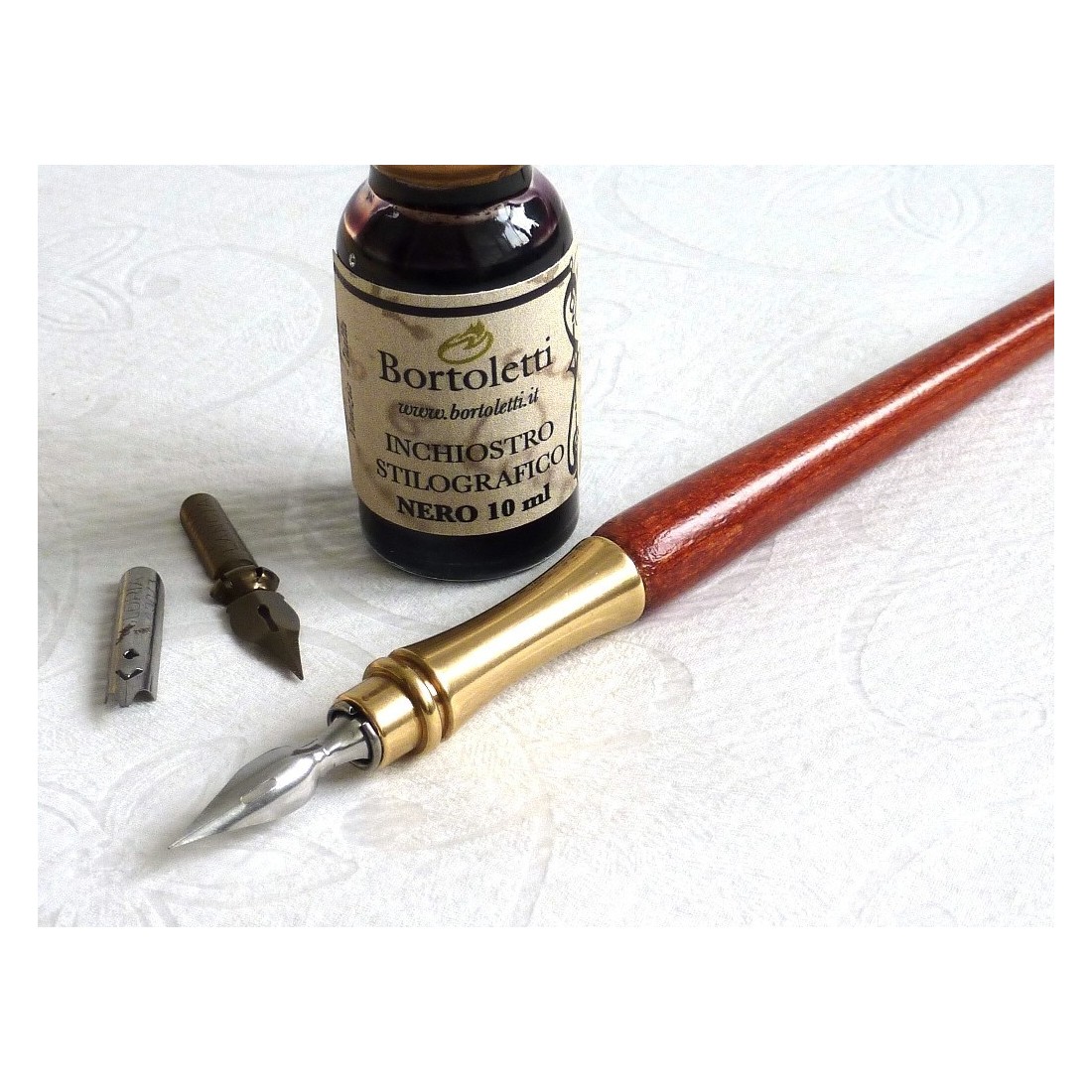 Bortoletti Set de calligraphie de bois et laiton Est un élégant jeu d'écriture italien avec un stylo à plongée en bois avec porte-nib en laiton, une bouteille d'encre de 10 ml et trois nibiles antiques. Maintenant, interrompu et disponible uniquement pendant que le dernier stock reste, c'est un choix raffiné pour l'écriture traditionnelle, l'affichage de bureau et le cadeau réfléchi.