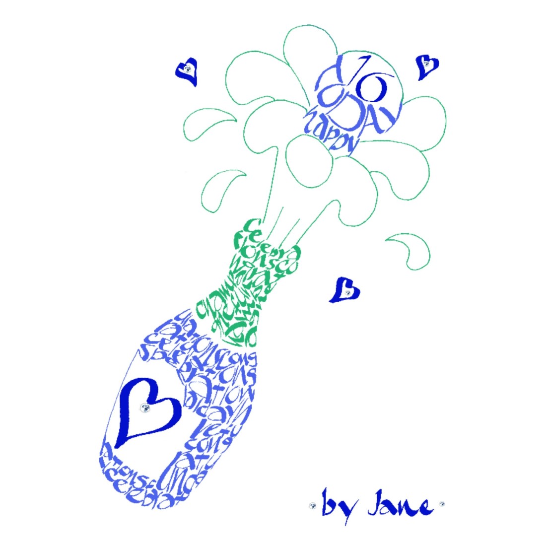 La celebrazione Champagne Men Card da Calligraphy Arts è un unico cartolina d'auguri a mano disegnata da Jane, con le parole calligrafiche "Happy", "feste", "Champagne" e "congratulazioni", con toni blu e verdi e una scelta di età nel tappo.