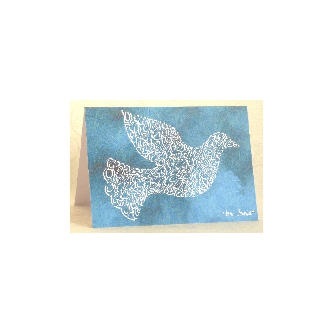 La colomba della carta di pace da Calligraphy Arts È un bellissimo biglietto di auguri calligrafico disegnato da Jane, con una colomba bianca, uno sfondo blu e verde vorticoso e le parole "pace, amore, felicità".