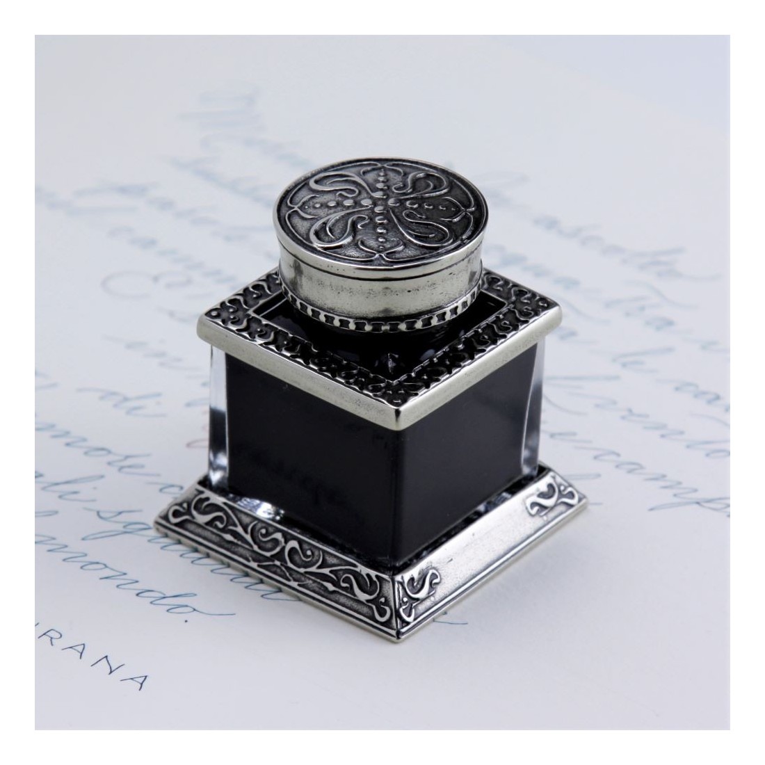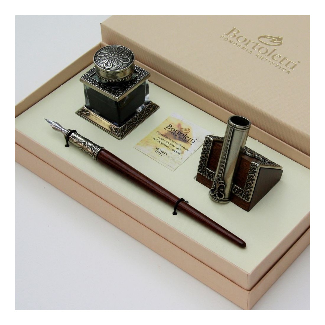 Penna di immersione in legno, inkwell e supporto penna. Questo set comprende una penna di legno con portabicchieri in bronzo placcato in argento nichel e un inkwell. La decorazione argento nickle arricchisce la penna in legno, il calamaio e il portapenne. Prodotto in Italia da Bortoletti Fonderia Artistica.