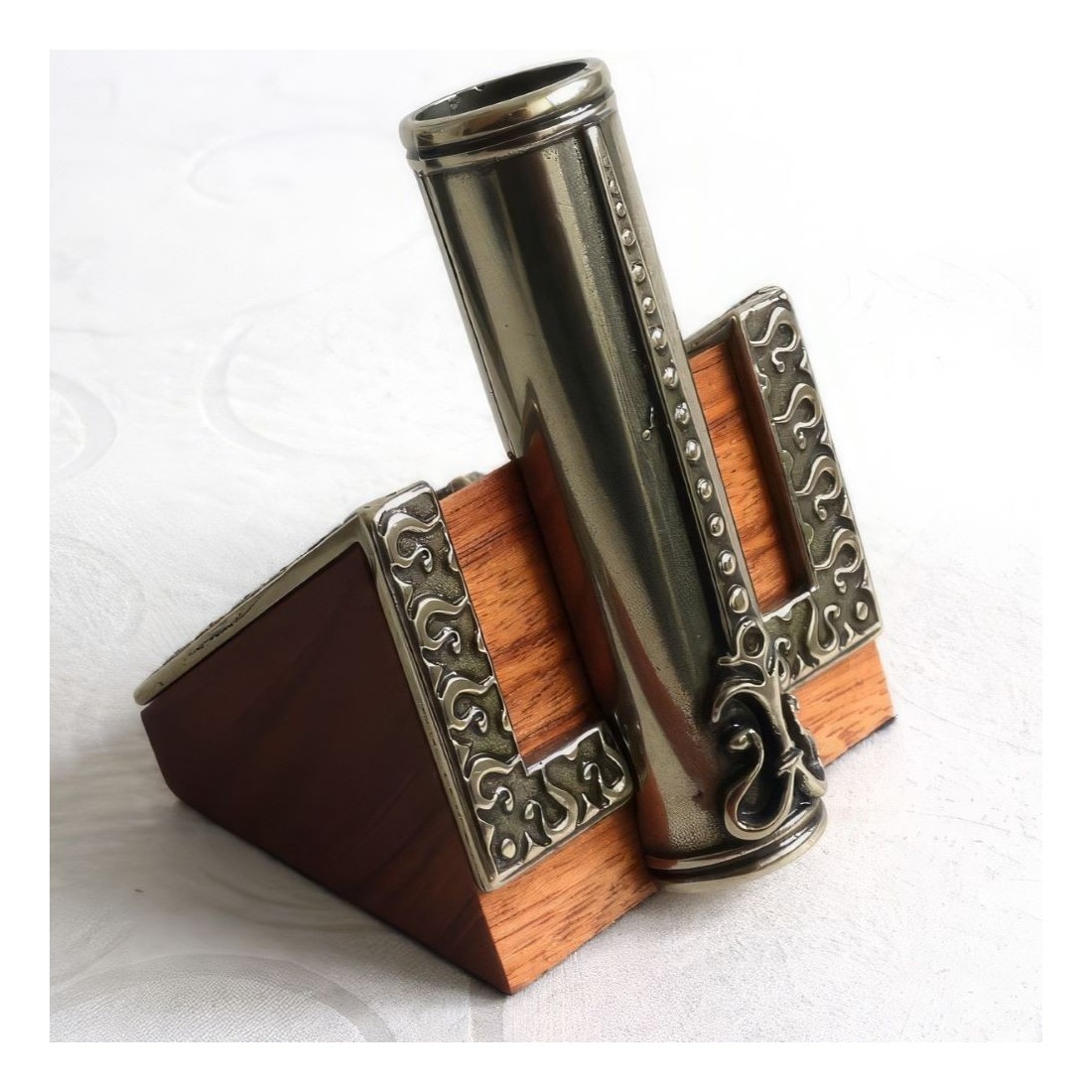 Penna di immersione in legno, inkwell e supporto penna. Questo set comprende una penna di legno con portabicchieri in bronzo placcato in argento nichel e un inkwell. Nichel argento e legno insieme a gusto e semplicità. La decorazione argento nickle arricchisce la penna in legno, il calamaio e il portapenne. Un set da scrivania essenziale con penna, inkwell e supporto penna.