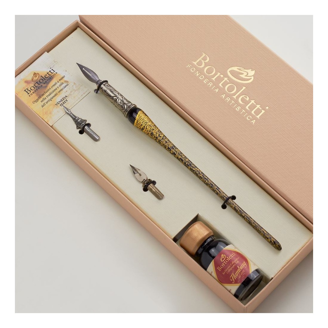 Bortoletti staat bekend om het creëren van elegante schrijfinstrumenten en bureaubuizen geïnspireerd door Venetië, Murano Glass ArtISTRY, en traditionele decoratieve vakmanschap. De Andrea-set weerspiegelt dat erfgoed door zijn handgemaakte glazen lichaam, goudblad afwerking en zorgvuldig gekozen penps. Het is een schrijfset die het Italiaanse vakmanschap, visuele elegantie en praktische schrijfbemiddeling samenbrengt.