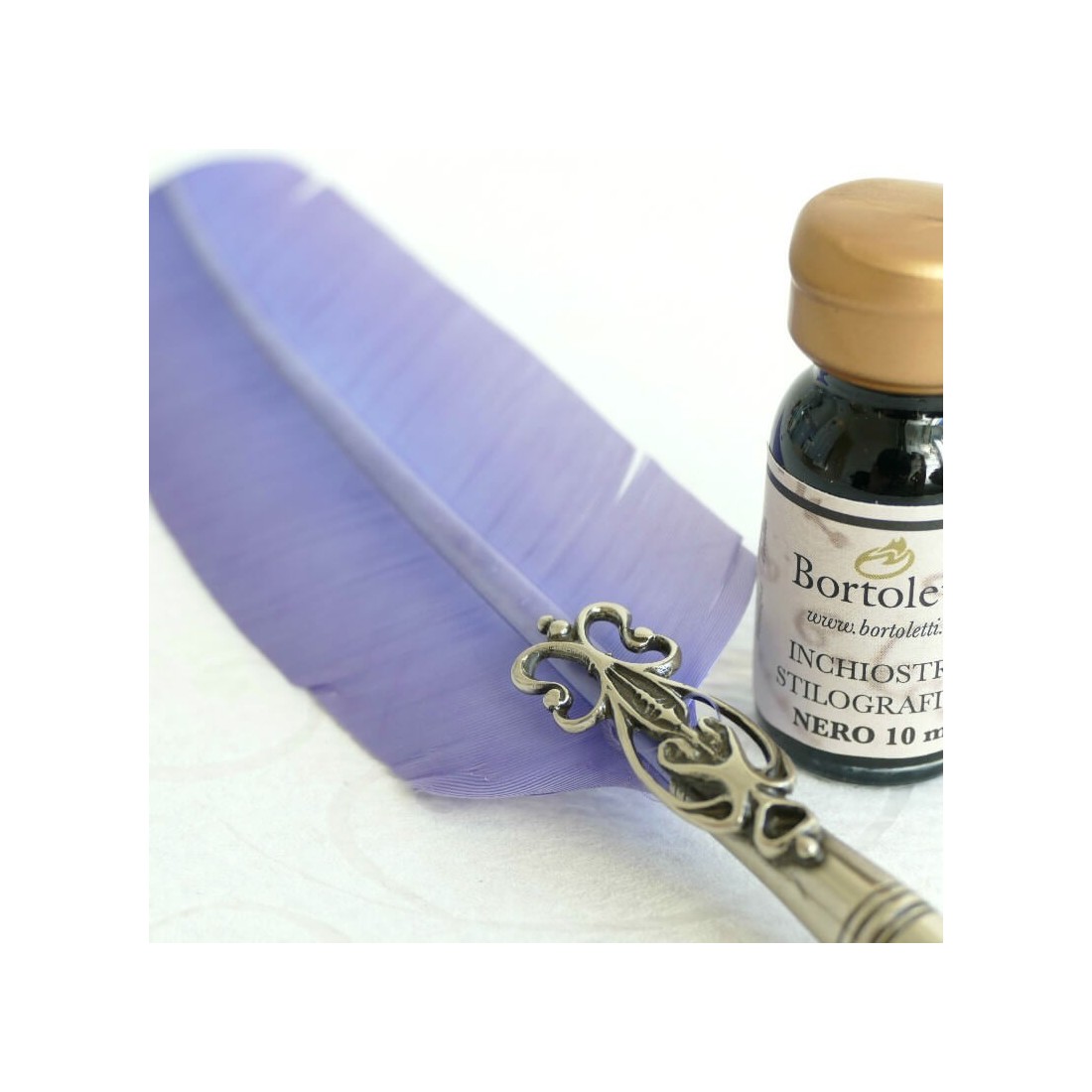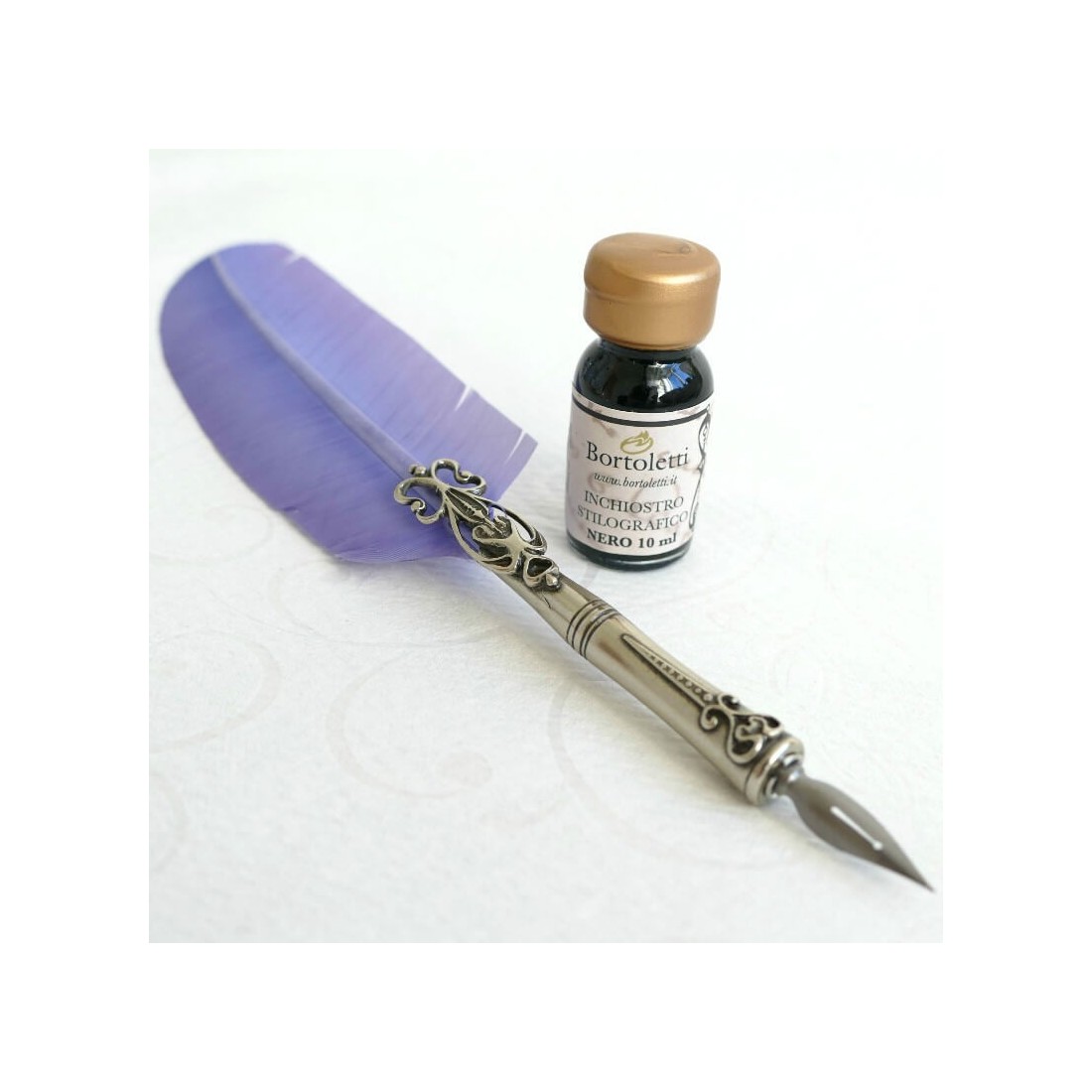 Bortoletti Veerpensets maken gedenkwaardige geschenken voor kalligrafen, schrijvers, verzamelaars en liefhebbers van fijne briefpapier. Met zijn ganzenveer, brons detaillering, meerdere penpunten en gebottelde inkt, is deze set bijzonder goed geschikt voor klanten die traditionele schrijfgereedschappen en decoratieve bureaubroopressoires waarderen.