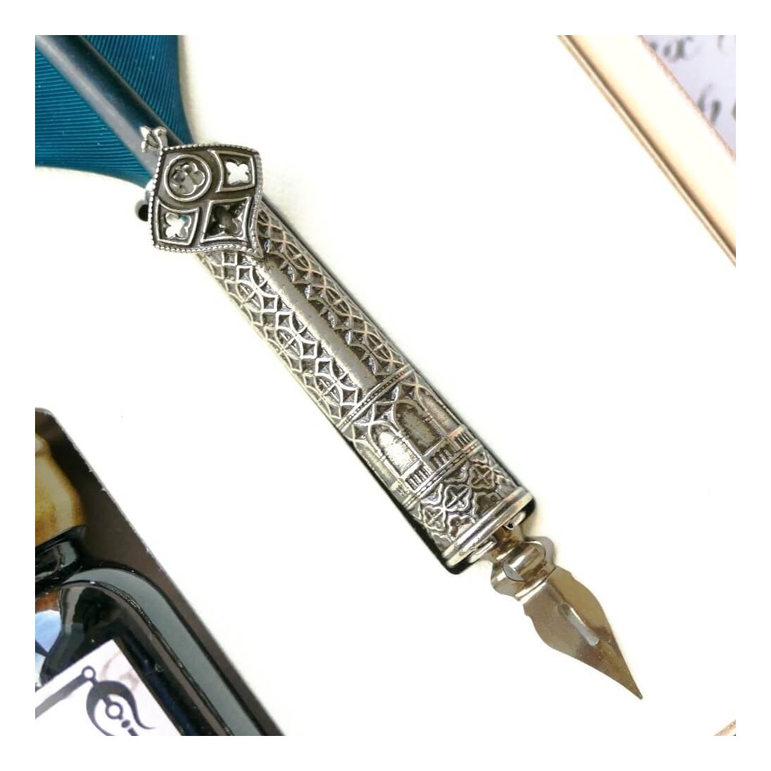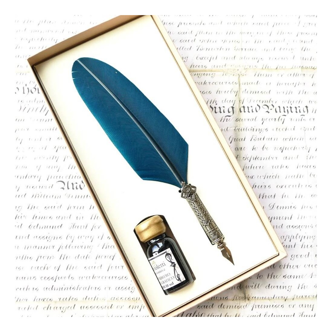 Bortoletti CA 'd'Oro Turquoise Feather Quill Pen en Ink Set