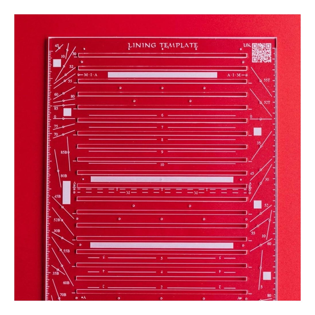 Gefabriceerd van CLEAR 3 mm PERPEX, de sjabloon zit plat en stabiel op pads of blanco vellen, zodat u horizontale en axiale lijnen met vertrouwen en herhaalbare nauwkeurigheid kunt regeren. De transparantie houdt uw lay-out te allen tijde zichtbaar, waardoor nauwkeurig en intuïtief is.