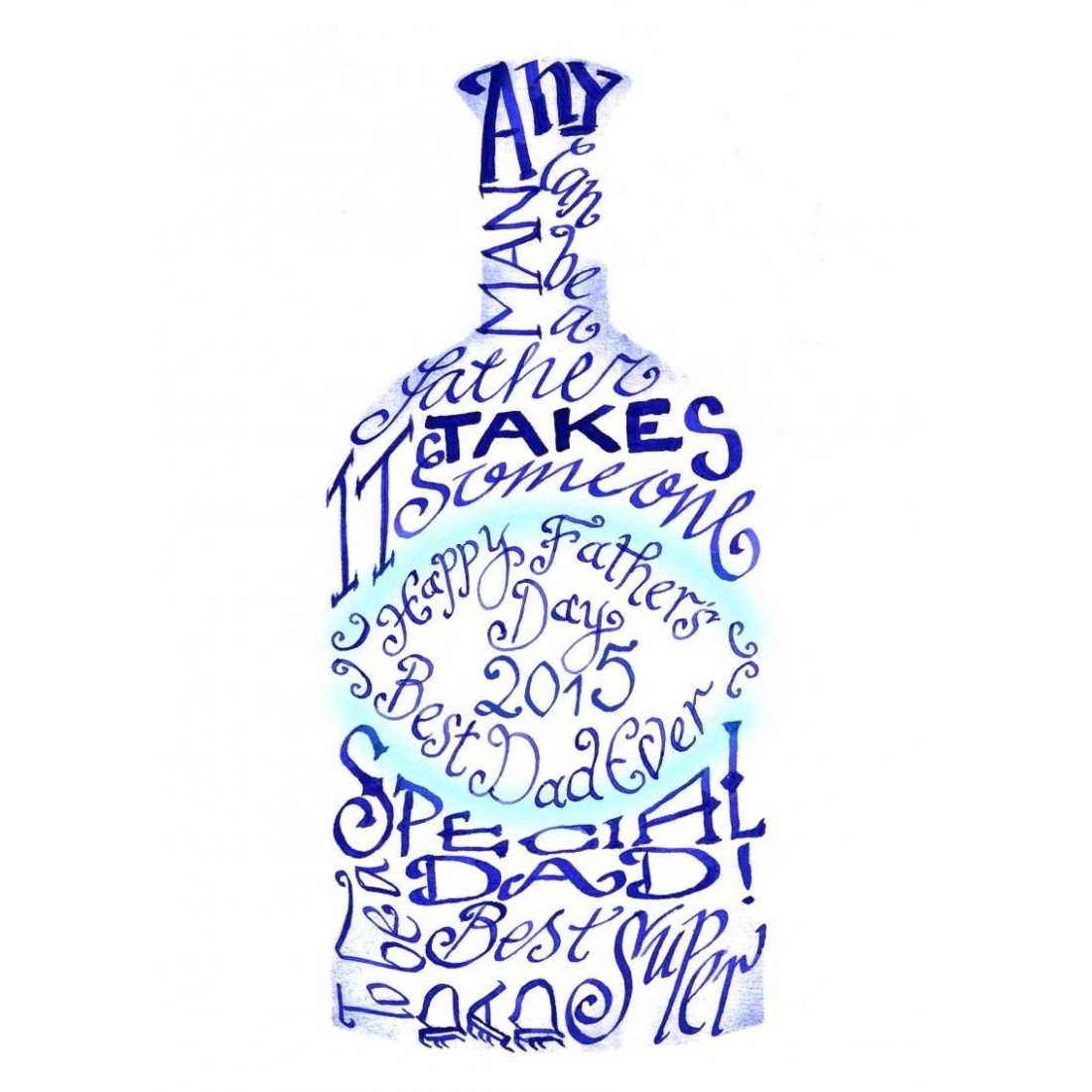 De beste vader van de vader van vader van Calligraphy Arts Is een handgemaakte kaart ontworpen door Jane, met de woorden "Elke man kan een vader zijn, het neemt iemand speciaal om een vader te zijn", "Happy Father's Day" en "Beste Super Dad" in tinten blauw en turkoois met een vleugje fonkeling.