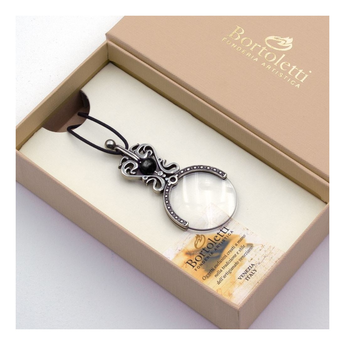 Bortoletti är känt för eleganta skrivbordstillbehör, skrivinstrument och dekorativa föremål inspirerade av Venedig, Murano glasartistry och traditionellt italienskt hantverk. Ranieri förstoringsglashängen speglar att arv genom sin handfabrikat, Murano Glass Pearl med silverblad och smycken-leddes design. Det är ett tillbehör som kombinerar praktisk användning med skönheten i hantverkare.