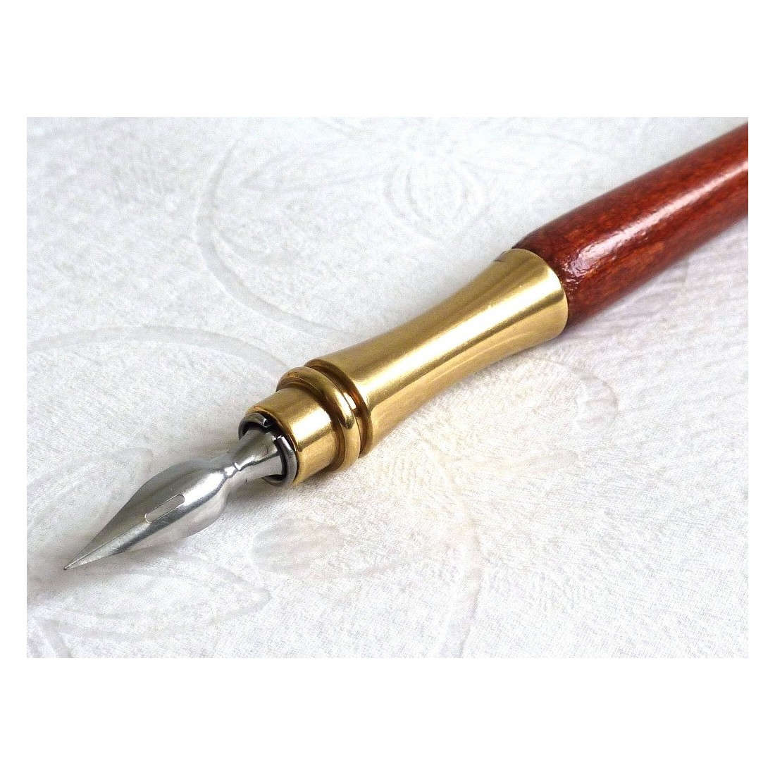 Pennan är gjord av trä och försedd med en mässingsnibhållare, vilket ger det ett balanserat och klassiskt utseende. Kombinationen av naturlig träkorn och varm mässingsdetaljer skapar ett skrivinstrument som känns både raffinerat och tilltämpligt, med en traditionell stil som passar arvsinspirerade brevpapperskollektioner.