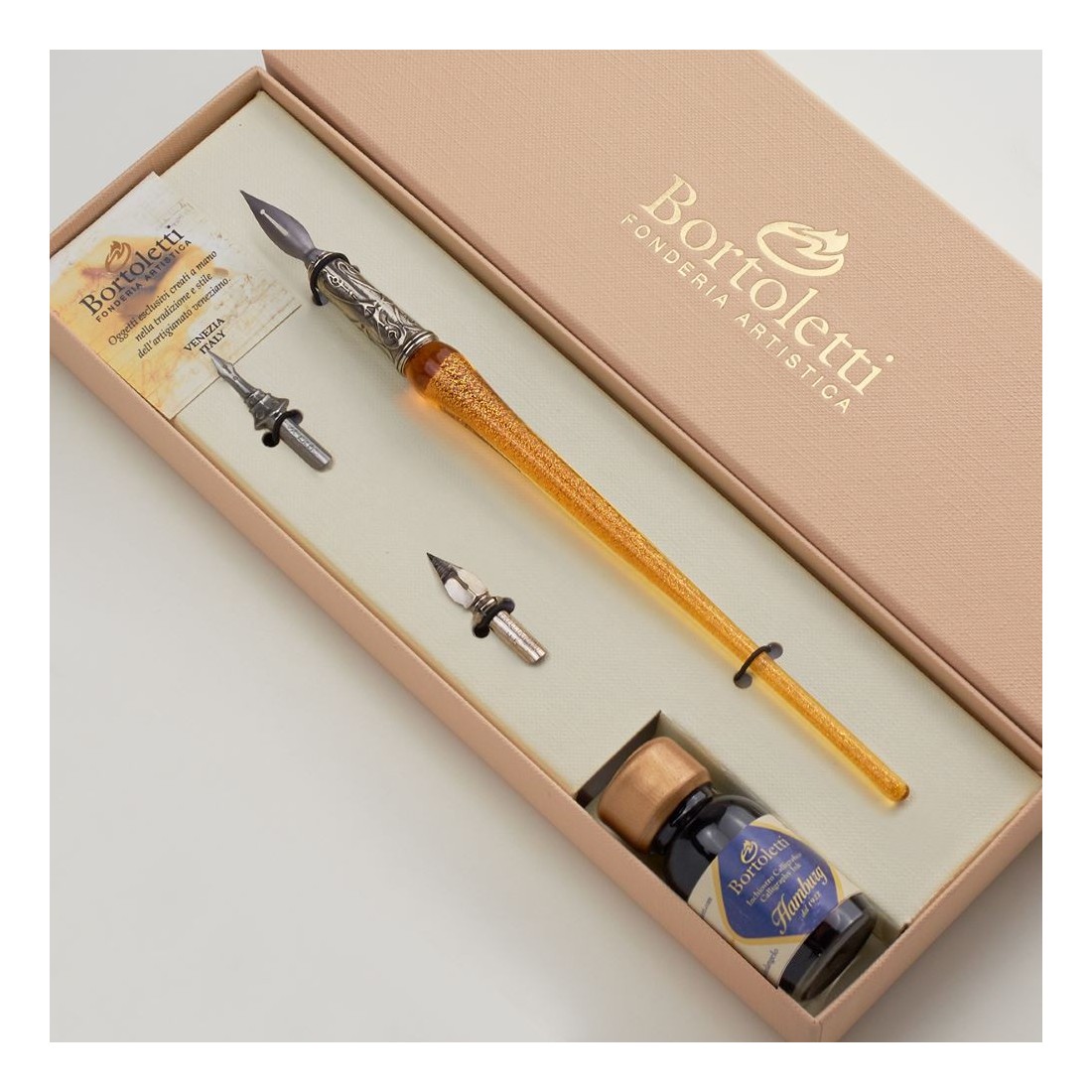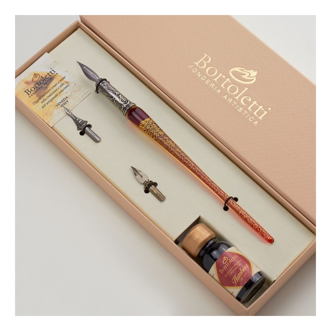 Bortoletti är känt för att skapa eleganta skrivinstrument och skrivbordstillbehör inspirerade av Venedig, Murano glasartistry och traditionellt dekorativt utförande. Andrea-uppsättningen speglar att arv genom sin handgjorda glaskropp, guldblad och noggrant utvalda nib. Det är ett skrivsats som leder till italienskt hantverk, visuell elegans och praktisk skrivande överklagande.