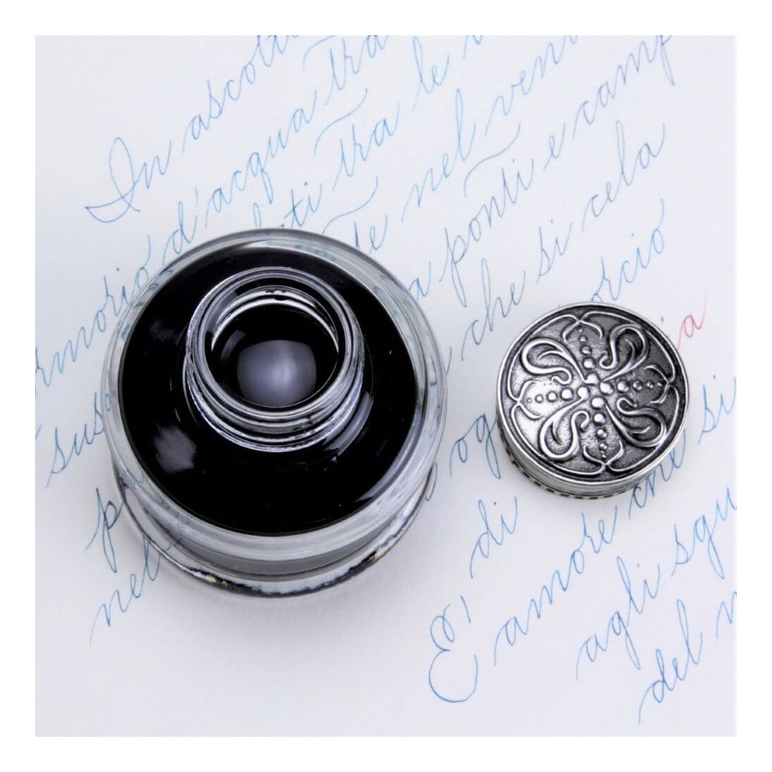 Denna inkwell innehåller högkvalitativ Bortoletti - Hamburg kalligrafi bläck, känd för sin rika pigmentering och stark färgretention en gång torr. Cagliostro Black Black framkallar mysteriet och djupet av alkemisk tradition, som producerar djärvt, uttrycksfullt bokstäver med utmärkt flöde.