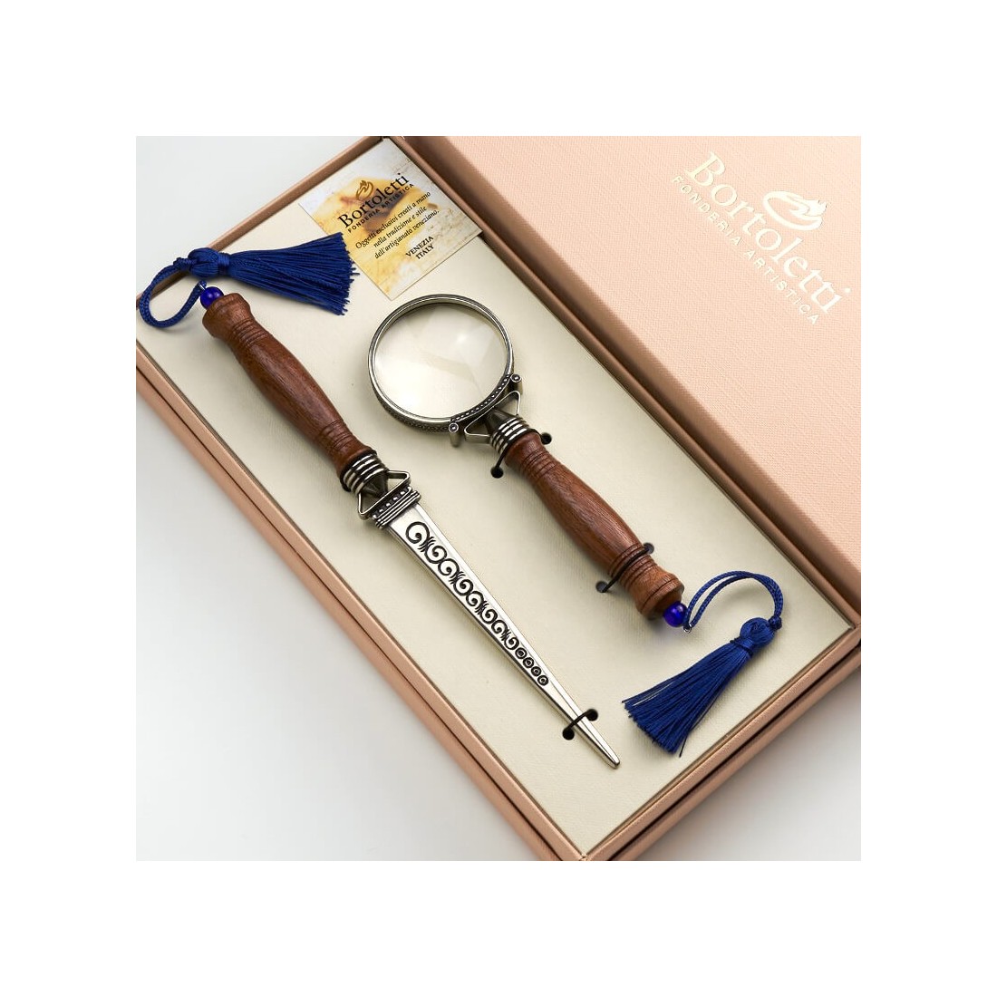 Bortoletti Fonderia Artistica i Venedig är känt för att producera fint utformade skrivartillbehör inspirerade av italienska dekorativa traditioner. Varje objekt börjar som en handfärdig design som formas med traditionell tillverkningsteknik, med noggrann uppmärksamhet på materialkvalitet, utförande och tidlös stil.