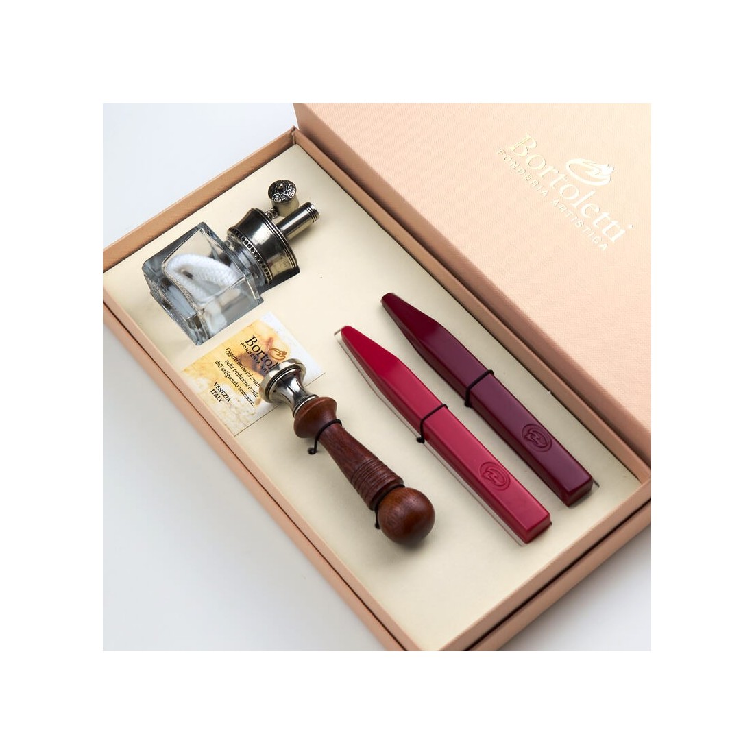 Denna Bortoletti Tätningskit innehåller a Trä vaxtätningshandtag, en Utbytbar 22 mm vaxtätningsstämpel, två tätande vaxpinnar, en alkoholbrännare, presentationsförpackning och ett certifikat av garanti. Det är en kompakt men komplett uppsättning för alla som vill skapa professionell vaxtätningar med traditionell karaktär.