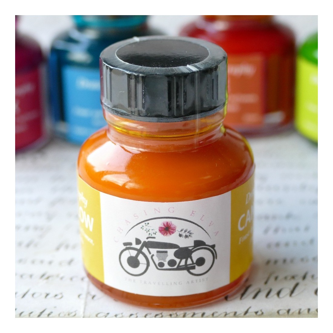Chasing Elva Kanarieögul akrylfärg är ett pulserande kalligrafi bläck utformat för uttrycksfulla dip penn bokstäver och kreativa projekt. Dess ljusa gula ton lägger energi och färg till dekorativ kalligrafi, illustration och konstnärligt bokstäver.